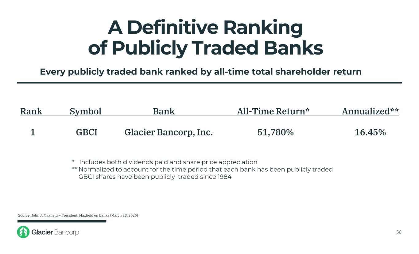 A Definitive Ranking of Publicly Traded Banks Every publicly traded bank ranked by all-time total shareholder return * Includes both dividends paid and share price appreciation ** Normalized to account for the time period that each bank has been publicly traded GBCI shares have been publicly traded since 1984 Source: John J. Maxfield – President, Maxfield on Banks (March 28, 2025) Rank Symbol Bank All-Time Return* Annualized** 1 GBCI Glacier Bancorp, Inc. 51,780% 16.45% 50