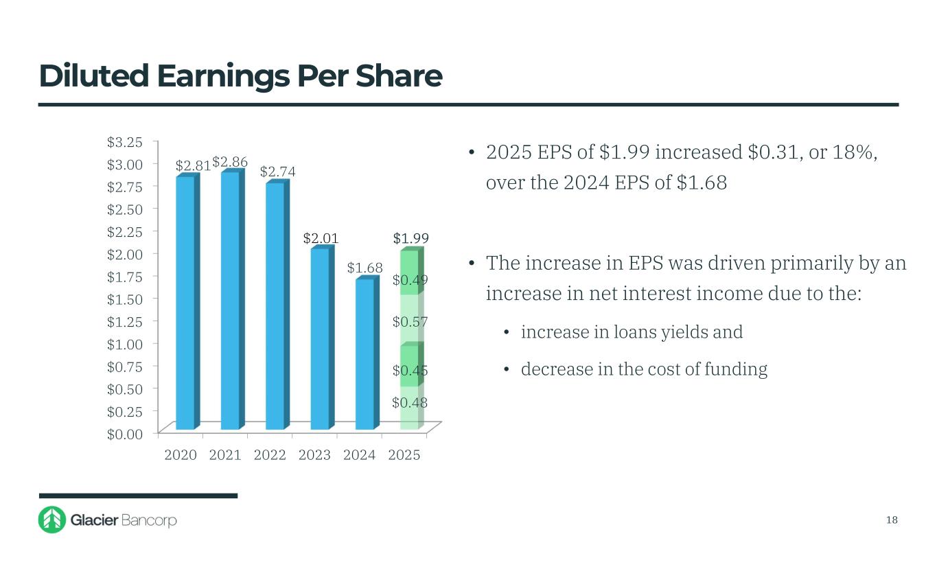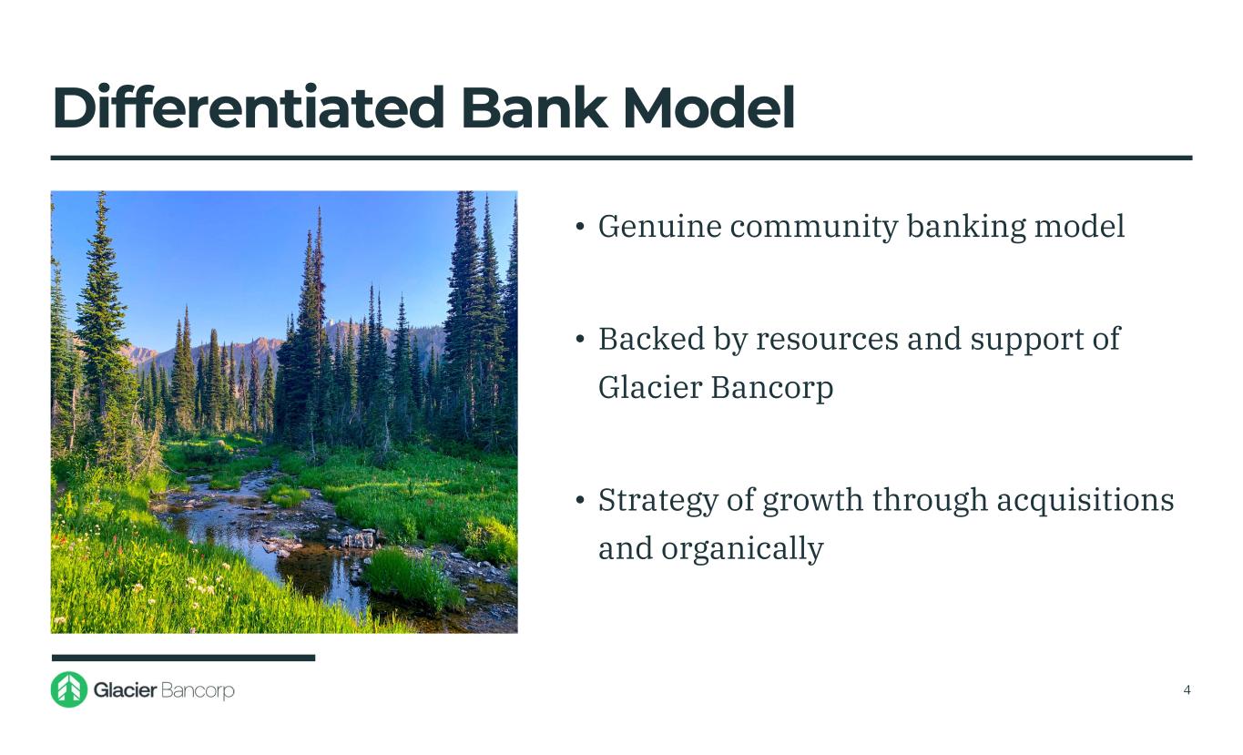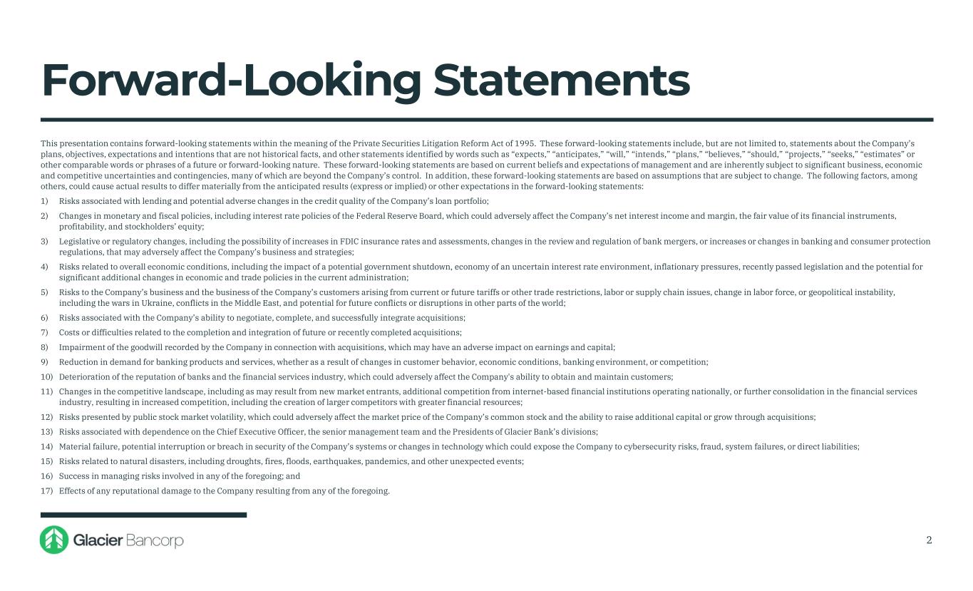 Forward-Looking Statements This presentation contains forward-looking statements within the meaning of the Private Securities Litigation Reform Act of 1995. These forward-looking statements include, but are not limited to, statements about the Company’s plans, objectives, expectations and intentions that are not historical facts, and other statements identified by words such as “expects,” “anticipates,” “will,” “intends,” “plans,” “believes,” “should,” “projects,” “seeks,” “estimates” or other comparable words or phrases of a future or forward-looking nature. These forward-looking statements are based on current beliefs and expectations of management and are inherently subject to significant business, economic and competitive uncertainties and contingencies, many of which are beyond the Company’s control. In addition, these forward-looking statements are based on assumptions that are subject to change. The following factors, among others, could cause actual results to differ materially from the anticipated results (express or implied) or other expectations in the forward-looking statements: 1) Risks associated with lending and potential adverse changes in the credit quality of the Company’s loan portfolio; 2) Changes in monetary and fiscal policies, including interest rate policies of the Federal Reserve Board, which could adversely affect the Company’s net interest income and margin, the fair value of its financial instruments, profitability, and stockholders’ equity; 3) Legislative or regulatory changes, including the possibility of increases in FDIC insurance rates and assessments, changes in the review and regulation of bank mergers, or increases or changes in banking and consumer protection regulations, that may adversely affect the Company’s business and strategies; 4) Risks related to overall economic conditions, including the impact of a potential government shutdown, economy of an uncertain interest rate environment, inflationary pressures, recently passed legislation and the potential for significant additional changes in economic and trade policies in the current administration; 5) Risks to the Company’s business and the business of the Company’s customers arising from current or future tariffs or other trade restrictions, labor or supply chain issues, change in labor force, or geopolitical instability, including the wars in Ukraine, conflicts in the Middle East, and potential for future conflicts or disruptions in other parts of the world; 6) Risks associated with the Company’s ability to negotiate, complete, and successfully integrate acquisitions; 7) Costs or difficulties related to the completion and integration of future or recently completed acquisitions; 8) Impairment of the goodwill recorded by the Company in connection with acquisitions, which may have an adverse impact on earnings and capital; 9) Reduction in demand for banking products and services, whether as a result of changes in customer behavior, economic conditions, banking environment, or competition; 10) Deterioration of the reputation of banks and the financial services industry, which could adversely affect the Company's ability to obtain and maintain customers; 11) Changes in the competitive landscape, including as may result from new market entrants, additional competition from internet-based financial institutions operating nationally, or further consolidation in the financial services industry, resulting in increased competition, including the creation of larger competitors with greater financial resources; 12) Risks presented by public stock market volatility, which could adversely affect the market price of the Company’s common stock and the ability to raise additional capital or grow through acquisitions; 13) Risks associated with dependence on the Chief Executive Officer, the senior management team and the Presidents of Glacier Bank’s divisions; 14) Material failure, potential interruption or breach in security of the Company’s systems or changes in technology which could expose the Company to cybersecurity risks, fraud, system failures, or direct liabilities; 15) Risks related to natural disasters, including droughts, fires, floods, earthquakes, pandemics, and other unexpected events; 16) Success in managing risks involved in any of the foregoing; and 17) Effects of any reputational damage to the Company resulting from any of the foregoing. 2