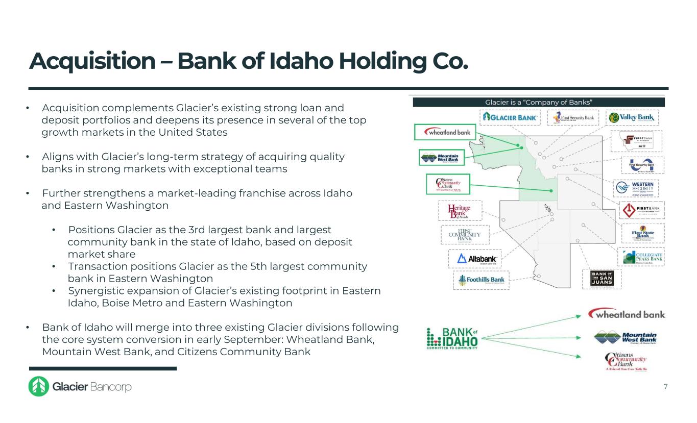 Acquisition – Bank of Idaho Holding Co. • Founded in 1985 and headquartered in Idaho Falls, Idaho • Full-service community bank, providing comprehensive financial services to businesses and individuals with 15 branch locations throughout Eastern Idaho, Boise Metro and Eastern Washington • Acquisition closed April 30, 2025 6