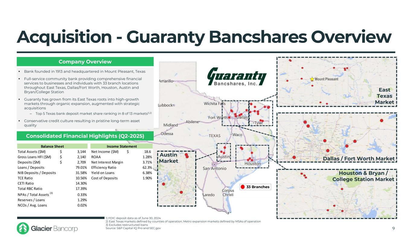 Acquisition – Bank of Idaho Holding Co. (“BOID”) Transaction Overview and Assumptions  100% stock consideration to BOID common shareholders  1.100x shares of Glacier Bancorp stock for each BOID share  BOID options and stock appreciation rights will be cashed out for their in-the-money value Consideration Mix  $234.3 million to common shareholders, or $52.47 per share(2)  $11.0 million to option and stock appreciation rights holders(3)  $245.4 million total transaction value Implied Transaction Value(1)  Gross credit mark discount of $14.2 million, or 1.41% of BOID’s gross loans  95% allocated to non-PCD loans, or $13.5 million  Non-PCD credit mark accreted over 5 years using the sum-of-years’ digits methodology  Establishment of CECL reserve for non-PCD loans of $13.5 million, reflected in pro forma TBV at closing Loan Credit Mark Estimate  Loan interest rate mark premium of $3.2 million, or 0.32% of BOID’s gross loans, amortized over 5 years using the sum-of-years’ digits methodology  Core deposit intangible of 1.75%, or $15.5 million, amortized over 10 years using the sum-of-years’ digits methodology  Elimination of BOID’s AOCI of $(9.4) million, accreted over 6 years using the sum-of-years’ digits methodology  Fixed asset write-up of $3.3 million; amortized over 20 years straight-line  Net fair value adjustment of $0.4 million for CDs and subordinated debt combined Other Adjustments and Fair Value Estimates  Cost savings of 30.0% of BOID’s non-interest expense  30.0% realized in 2025, 80.0% realized in 2026 and 100.0% thereafter Cost Savings  Estimated reduction of BOID’s interchange income by approximately $0.5 million annually, pre-taxDurbin Impact  Estimated one-time transaction costs of approximately $17.7 million, pre-taxTransaction Expenses(4)  Fixed exchange ratio with collars set between $35.74 and $53.60 (+/- 20% from GBCI stock price in LOI)Price Protection  $122.1 million at closing  Excess tangible common equity, net of any adjustments for BOID’s final transaction expenses, to be paid out to BOID shareholders at closingMinimum Tangible Equity  April 30, 2025Acquisition Date (1) Based on GBCI closing price of $47.70 on 1/10/2025 (2) Includes 4,420,332 BOID shares and 45,413 RSUs which will vest at closing (3) Includes 370,725 options with a weighted average exercise price of $24.87 and 24,291 SARs with a weighted average grant price of $19.08 (4) Including employment and benefit plan costs, data contract termination and conversion costs and combined professional and advisory fees 8