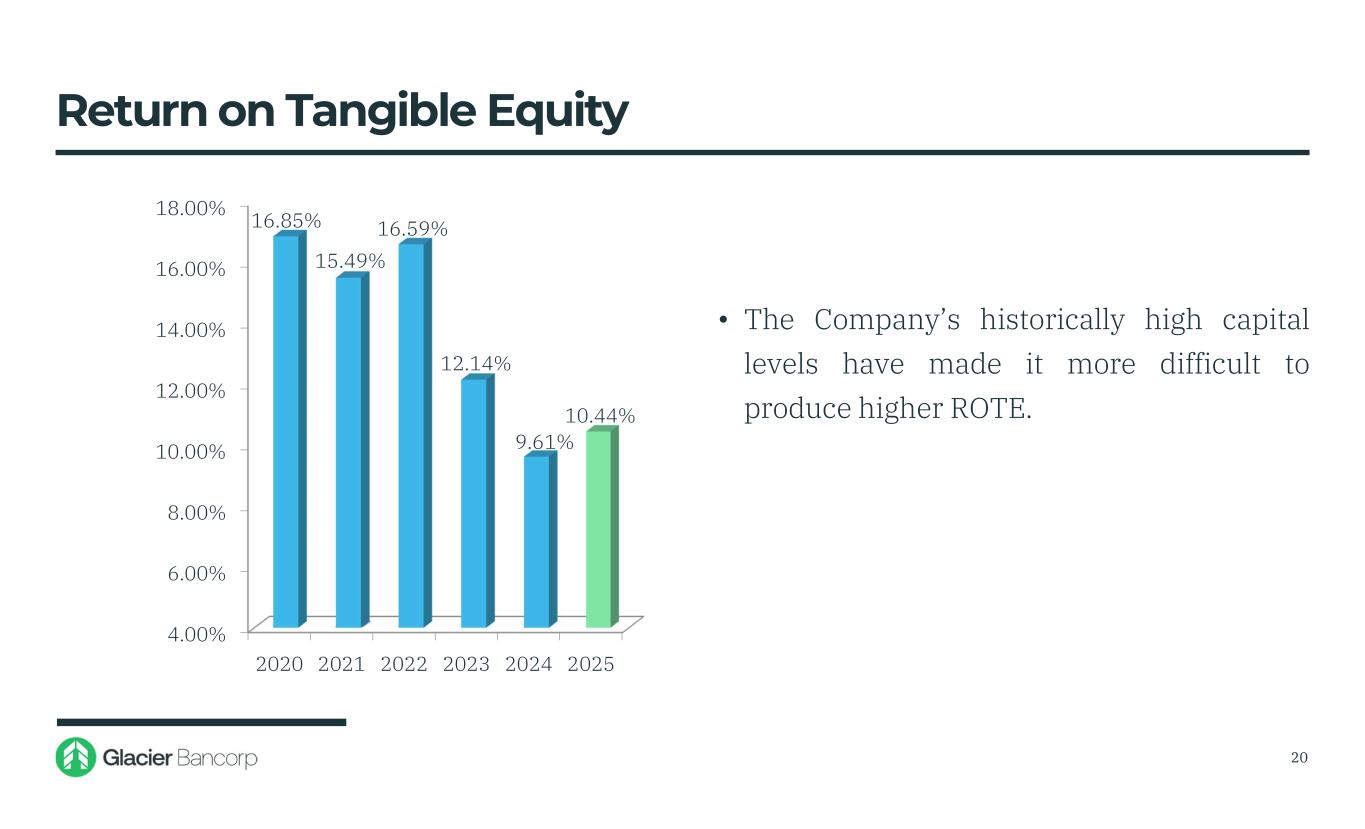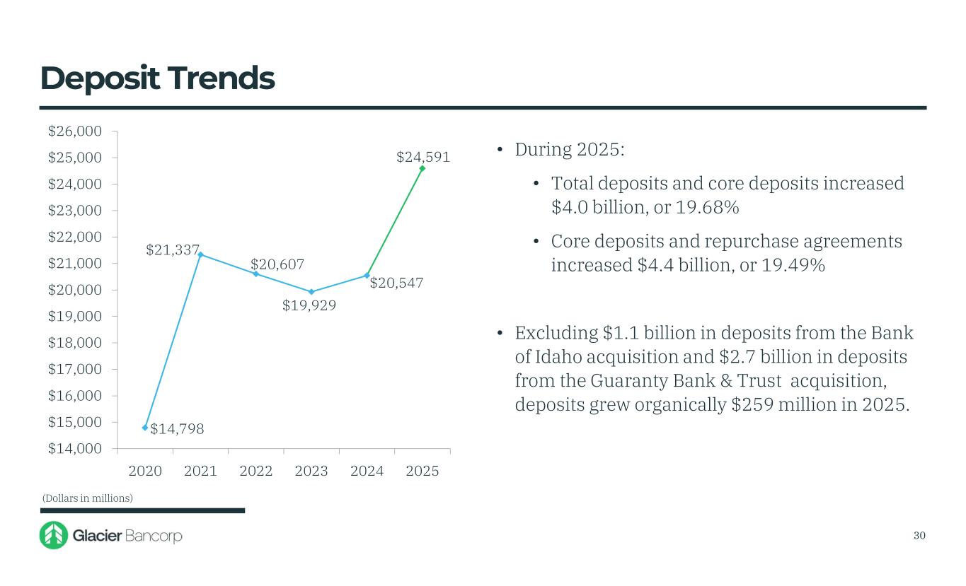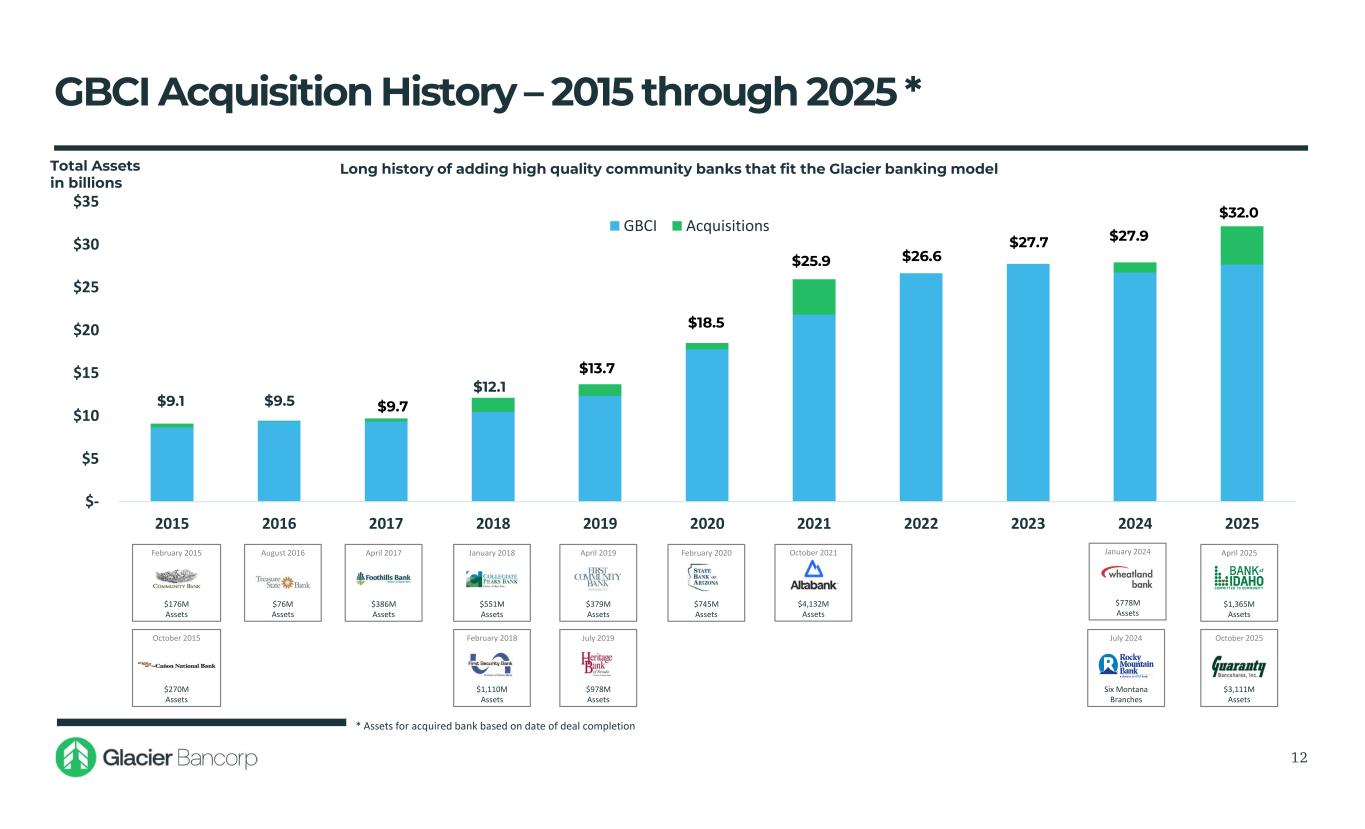 Glacier Bancorp Inc. 12/31/2025 Snapshot GBCITicker $31.98 billionTotal Assets $20.93 billionGross Loans $24.59 billionDeposits $21.01TCBV Per Share $1.32Dividends $44.05Stock Price $5.73 billionMarket Cap 3