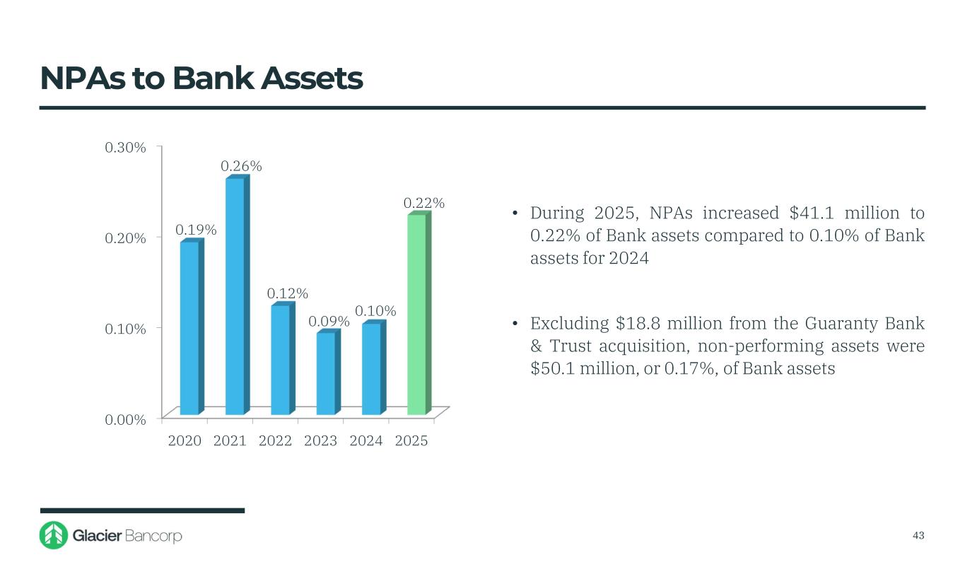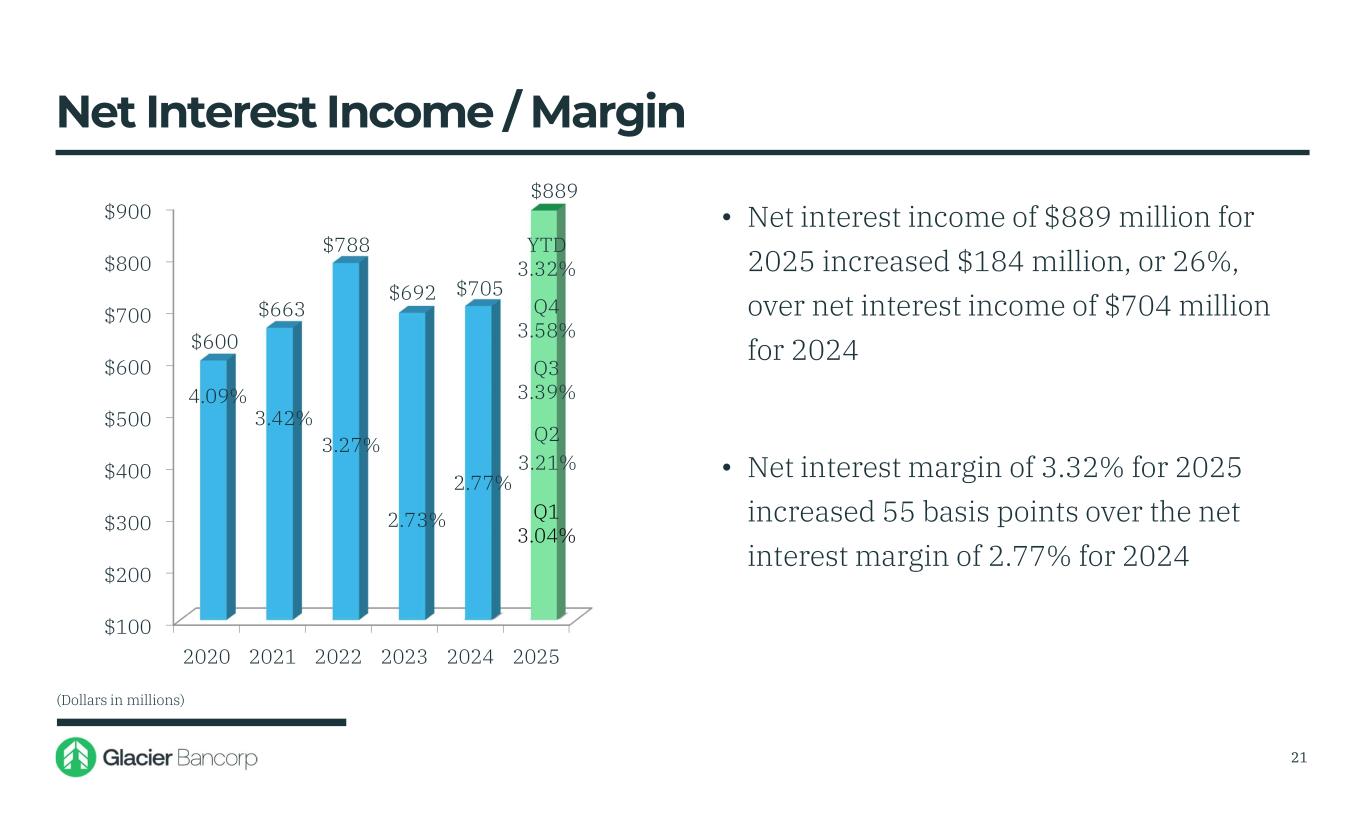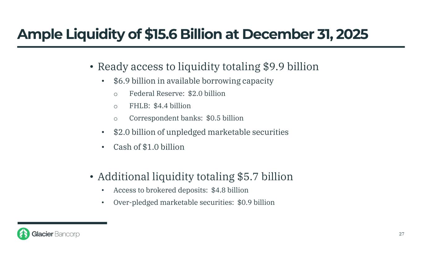 Glacier Bancorp Inc. 12/31/2025 Snapshot GBCITicker $31.98 billionTotal Assets $20.93 billionGross Loans $24.59 billionDeposits $21.01TCBV Per Share $1.32Dividends $44.05Stock Price $5.73 billionMarket Cap 3