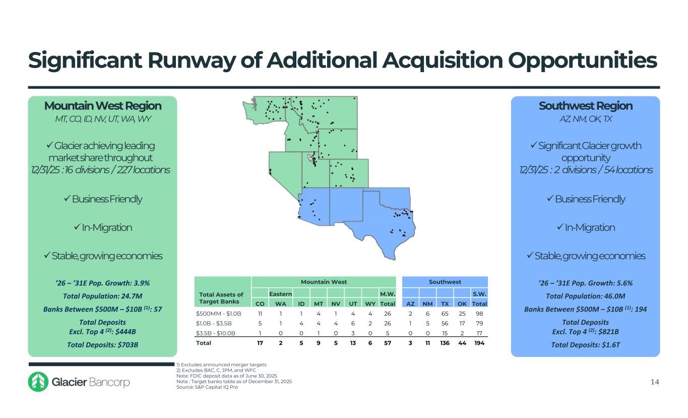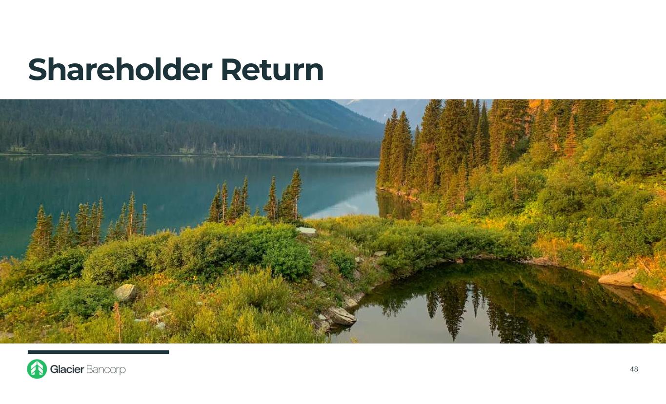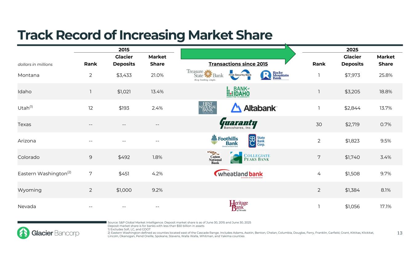 20252015 MarketGlacierMarketGlacier ShareDepositsRankTransactions since 2015ShareDepositsRankdollars in millions 25.8%$7,973121.0%$3,4332Montana 18.8%$3,205113.4%$1,0211Idaho 13.7%$2,84412.4%$19312Utah(1) 0.7%$2,71930------Texas 9.5%$1,8232------Arizona 3.4%$1,74071.8%$4929Colorado 9.7%$1,50844.2%$4517Eastern Washington(2) 8.1%$1,38429.2%$1,0002Wyoming 17.1%$1,0561------Nevada Track Record of Increasing Market Share Source: S&P Global Market Intelligence. Deposit market share is as of June 30, 2015 and June 30, 2025 Deposit market share is for banks with less than $50 billion in assets 1) Excludes Sofi, LC, and GDOT 2) Eastern Washington defined as counties located east of the Cascade Range. Includes Adams, Asotin, Benton, Chelan, Columbia, Douglas, Ferry, Franklin, Garfield, Grant, Kittitas, Klickitat, Lincoln, Okanogan, Pend Oreille, Spokane, Stevens, Walla Walla, Whitman, and Yakima counties 13