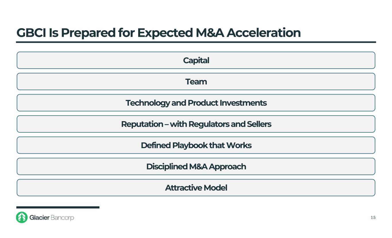 Significant Runway of Additional Acquisition Opportunities 14 1) Excludes announced merger targets 2) Excludes BAC, C, JPM, and WFC Note: FDIC deposit data as of June 30, 2025 Note : Target banks table as of December 31, 2025 Source: S&P Capital IQ Pro Mountain West Region Business Friendly In-Migration Stable, growing economies Glacier achieving leading market share throughout 12/31/25 : 16 divisions / 227 locations Southwest Region Business Friendly In-Migration Stable, growing economies Significant Glacier growth opportunity 12/31/25 : 2 divisions / 54 locations ’26 – ’31E Pop. Growth: 5.6% Total Population: 46.0M Banks Between $500M – $10B (1): 194 Total Deposits Excl. Top 4 (2): $821B Total Deposits: $1.6T ’26 – ’31E Pop. Growth: 3.9% Total Population: 24.7M Banks Between $500M – $10B (1): 57 Total Deposits Excl. Top 4 (2): $444B Total Deposits: $703B MT, CO, ID, NV, UT, WA, WY AZ, NM, OK, TX SouthwestMountain West Total Assets of Target Banks S.W.M.W.Eastern TotalOKTXNMAZTotalWYUTNVMTIDWACO 982565622644141111$500MM - $1.0B 79175651262644415$1.0B - $3.5B 172150050301001$3.5B - $10.0B 1944413611357613595217Total