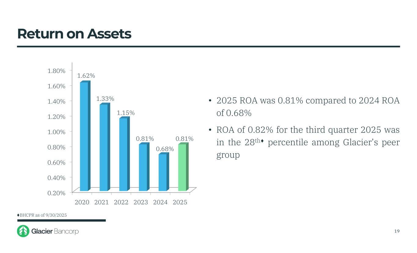 0.20% 0.40% 0.60% 0.80% 1.00% 1.20% 1.40% 1.60% 1.80% 2020 2021 2022 2023 2024 2025 1.62% 0.68% 1.33% 0.81% 0.81% • 2025 ROA was 0.81% compared to 2024 ROA of 0.68% • ROA of 0.82% for the third quarter 2025 was in the 28th percentile among Glacier’s peer group Return on Assets BHCPR as of 9/30/2025 1.15% 19