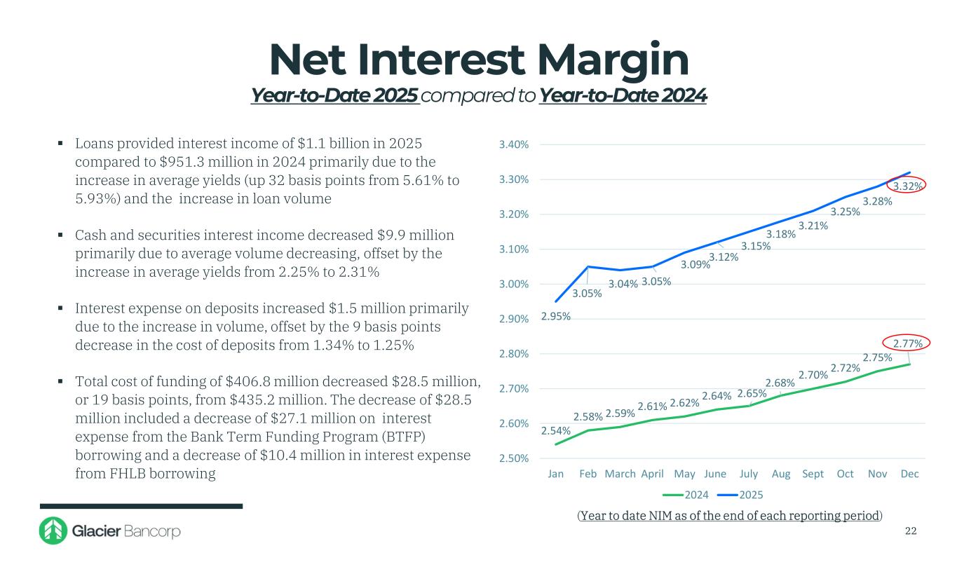 $100 $200 $300 $400 $500 $600 $700 $800 $900 2020 2021 2022 2023 2024 2025 $600 $663 $788 $692 $705 $889 4.09% 3.42% 3.27% 2.73% 2.77% Q2 3.21% Q1 3.04% • Net interest income of $889 million for 2025 increased $184 million, or 26%, over net interest income of $704 million for 2024 • Net interest margin of 3.32% for 2025 increased 55 basis points over the net interest margin of 2.77% for 2024 Net Interest Income / Margin (Dollars in millions) 21 YTD 3.32% Q3 3.39% Q4 3.58%