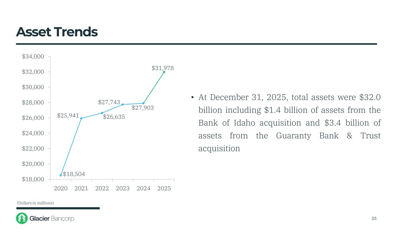 $18,504 $25,941 $26,635 $27,743 $27,903 $31,978 $18,000 $20,000 $22,000 $24,000 $26,000 $28,000 $30,000 $32,000 $34,000 2020 2021 2022 2023 2024 2025 • At December 31, 2025, total assets were $32.0 billion including $1.4 billion of assets from the Bank of Idaho acquisition and $3.4 billion of assets from the Guaranty Bank & Trust acquisition Asset Trends (Dollars in millions) 25
