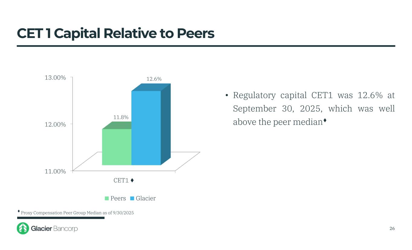11.00% 12.00% 13.00% CET1 11.8% 12.6% Peers Glacier • Regulatory capital CET1 was 12.6% at September 30, 2025, which was well above the peer median CET 1 Capital Relative to Peers Proxy Compensation Peer Group Median as of 9/30/2025 26