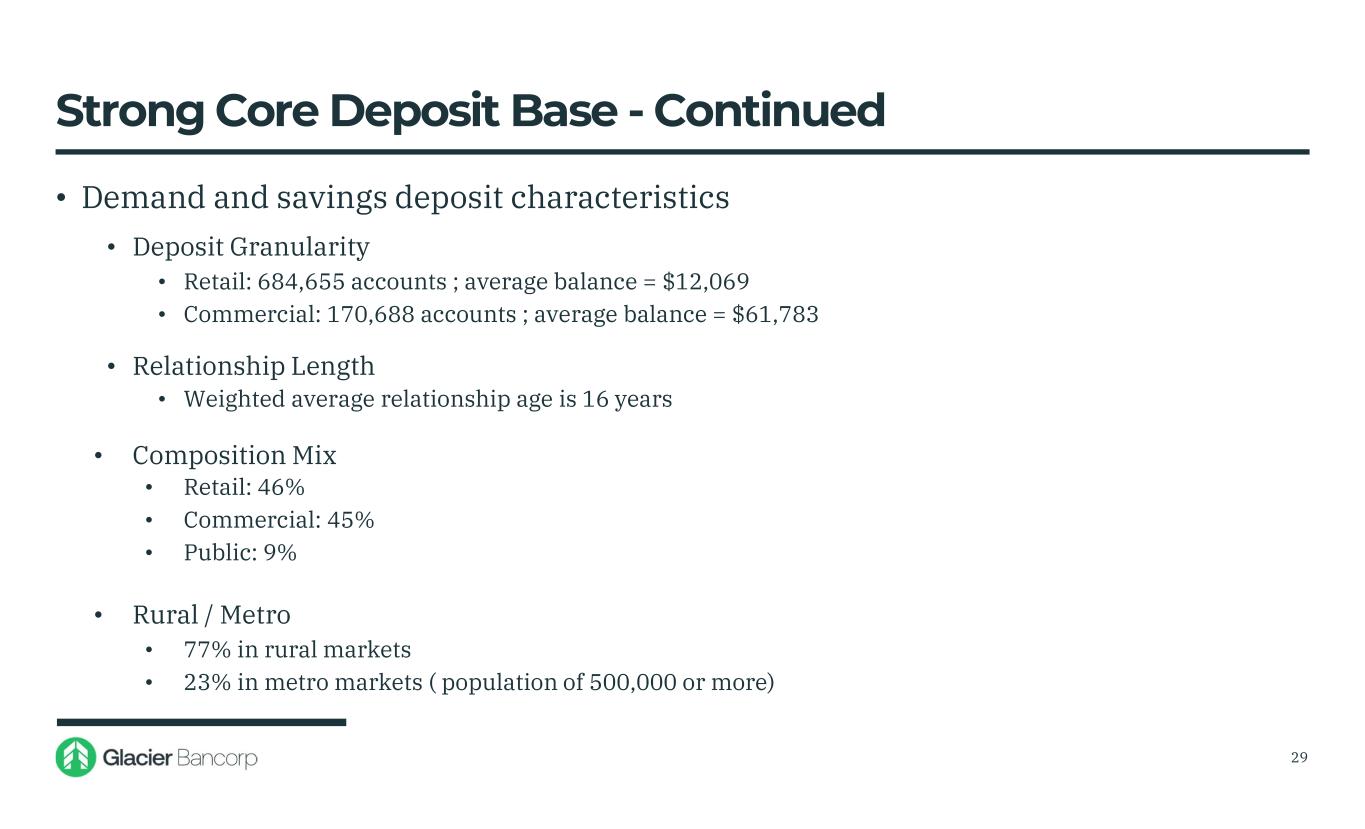Strong Core Deposit Base • Our community banking model is customer relationship driven • Uninsured deposits, excluding collateralized public deposits and cash held at the holding company, are 26% of total deposits • 36% of uninsured deposits are with customers that also have a loan relationship with us • Non-interest bearing deposits • 57% of non-interest bearing balances are in accounts with $250,000 or less • 50% of non-interest bearing deposits are with customers with multiple accounts • 80% of non-interest bearing balances are in business accounts 28