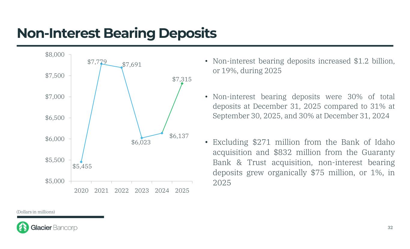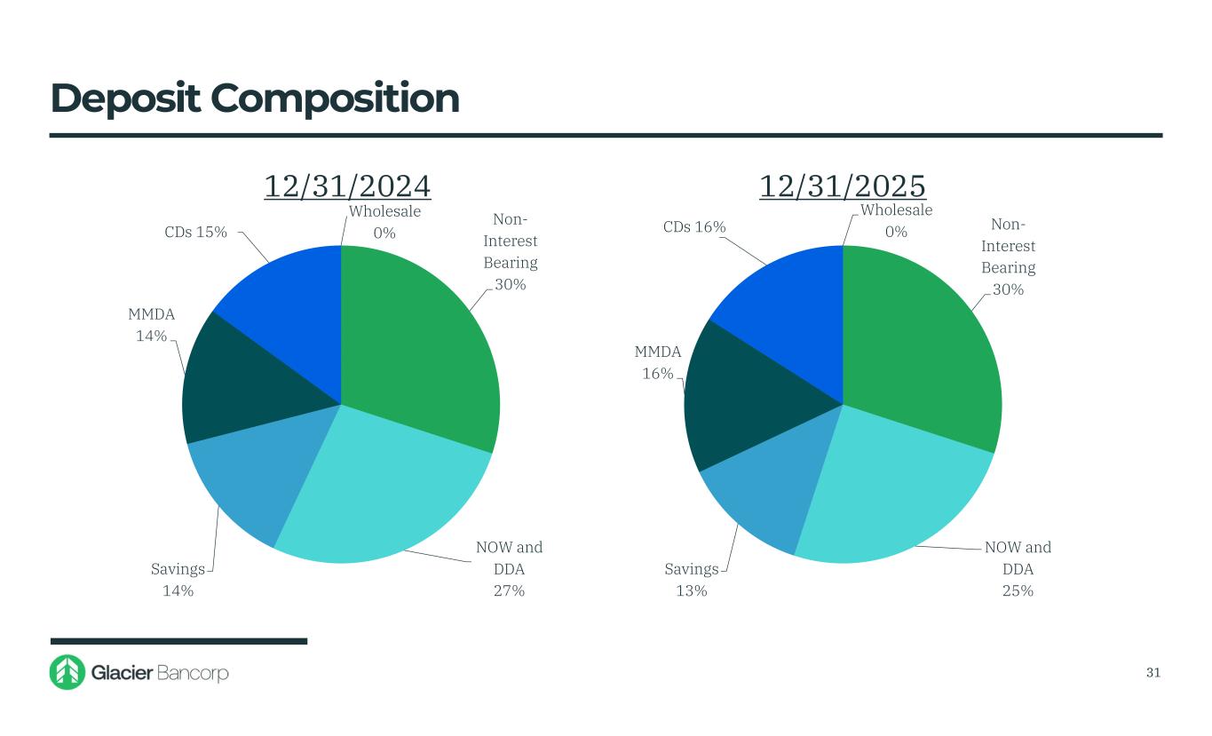 $14,798 $21,337 $20,607 $19,929 $20,547 $24,591 $14,000 $15,000 $16,000 $17,000 $18,000 $19,000 $20,000 $21,000 $22,000 $23,000 $24,000 $25,000 $26,000 2020 2021 2022 2023 2024 2025 • During 2025: • Total deposits and core deposits increased $4.0 billion, or 19.68% • Core deposits and repurchase agreements increased $4.4 billion, or 19.49% • Excluding $1.1 billion in deposits from the Bank of Idaho acquisition and $2.7 billion in deposits from the Guaranty Bank & Trust acquisition, deposits grew organically $259 million in 2025. Deposit Trends (Dollars in millions) 30