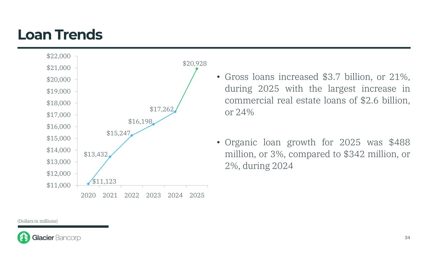 0.15% 0.09% 0.11% 1.22% 1.92% 1.77% 1.78% 0.53% 0.21% 0.58% 2.49% 3.17% 2.80% 0.00% 0.50% 1.00% 1.50% 2.00% 2.50% 3.00% 3.50% Glacier Peers • Interest-bearing deposit cost decreased to 1.78% at December 31, 2025, from 1.92% at December 31, 2024 due to market dynamics and the competitive rate environment • Total deposit cost decreased to 1.25% at December 31, 2025 from 1.34% at December 31, 2024 • Core deposits are a competitive advantage and will be a key driver of future performance Interest-Bearing Deposit Cost Relative to Peers Peer based on BHCPR as of 9/30/2025 33