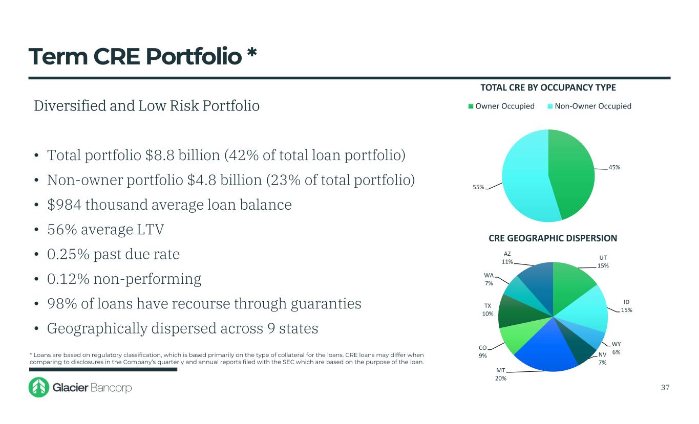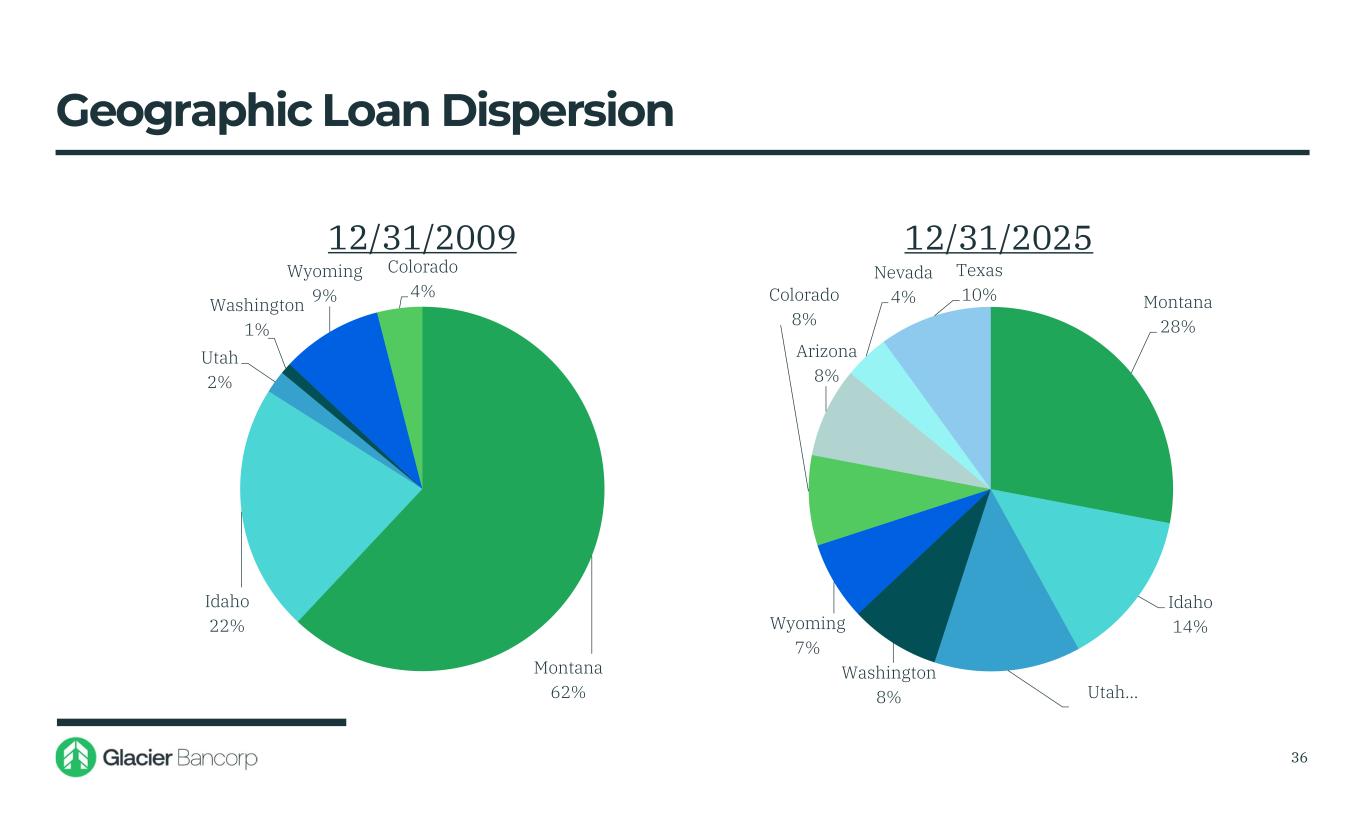 Montana 62% Idaho 22% Utah 2% Washington 1% Wyoming 9% Colorado 4% 12/31/2009 Montana 28% Idaho 14% Utah… Washington 8% Wyoming 7% Colorado 8% Arizona 8% Nevada 4% Texas 10% 12/31/2025 Geographic Loan Dispersion 36