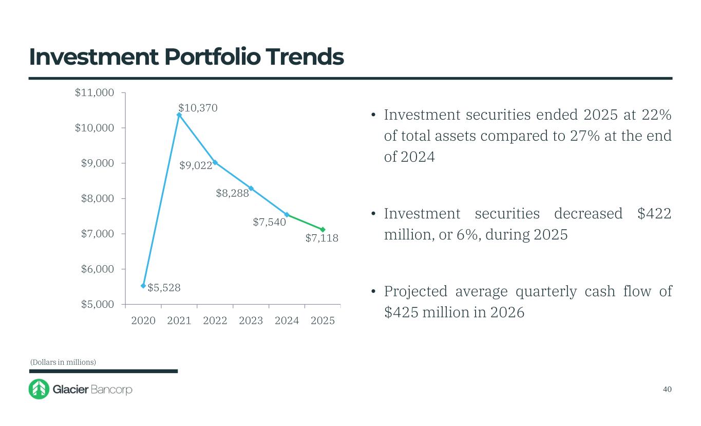 $5,528 $10,370 $9,022 $8,288 $7,540 $7,118 $5,000 $6,000 $7,000 $8,000 $9,000 $10,000 $11,000 2020 2021 2022 2023 2024 2025 • Investment securities ended 2025 at 22% of total assets compared to 27% at the end of 2024 • Investment securities decreased $422 million, or 6%, during 2025 • Projected average quarterly cash flow of $425 million in 2026 Investment Portfolio Trends (Dollars in millions) 40