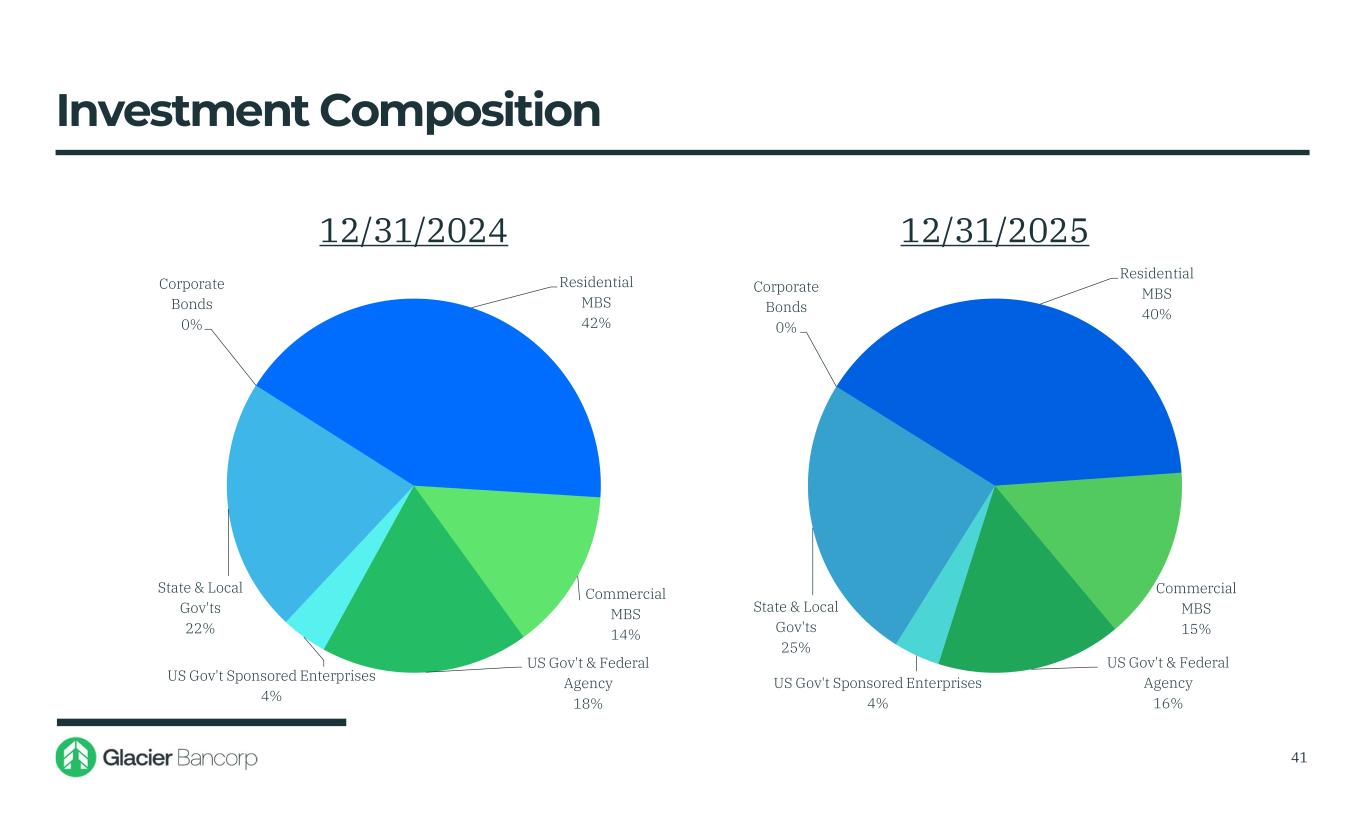 US Gov't & Federal Agency 18% US Gov't Sponsored Enterprises 4% State & Local Gov'ts 22% Corporate Bonds 0% Residential MBS 42% Commercial MBS 14% 12/31/2024 US Gov't & Federal Agency 16% US Gov't Sponsored Enterprises 4% State & Local Gov'ts 25% Corporate Bonds 0% Residential MBS 40% Commercial MBS 15% 12/31/2025 Investment Composition 41