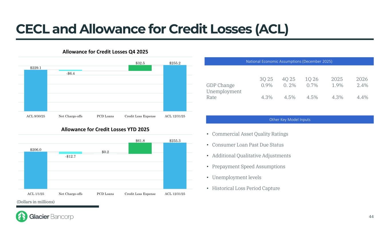CECL and Allowance for Credit Losses (ACL) • Commercial Asset Quality Ratings • Consumer Loan Past Due Status • Additional Qualitative Adjustments • Prepayment Speed Assumptions • Unemployment levels • Historical Loss Period Capture (Dollars in millions) Other Key Model Inputs National Economic Assumptions (December 2025) 202620251Q 26 4Q 25 3Q 25 2.4%1.9%0.7%0. 2%0.9%GDP Change 4.4%4.3%4.5%4.5%4.3% Unemployment Rate 1.19% of Total Loans 1.19% of Total Loans 44 $206.0 -$12.7 $0.2 $61.8 $255.3 ACL 1/1/25 Net Charge-offs PCD Loans Credit Loss Expense ACL 12/31/25 Allowance for Credit Losses YTD 2025 $229.1 -$6.4 $32.5 $255.2 ACL 9/30/25 Net Charge-offs PCD Loans Credit Loss Expense ACL 12/31/25 Allowance for Credit Losses Q4 2025