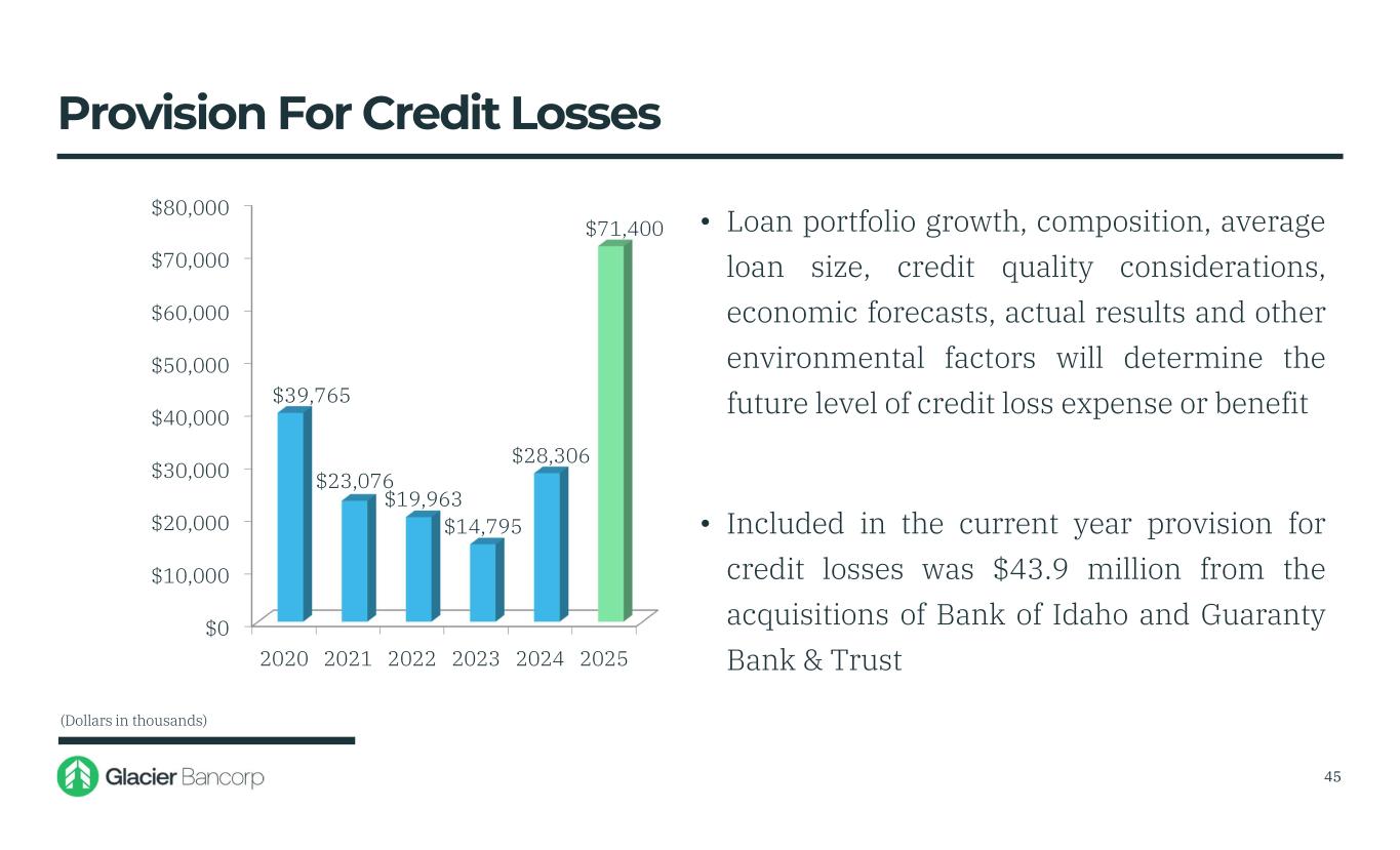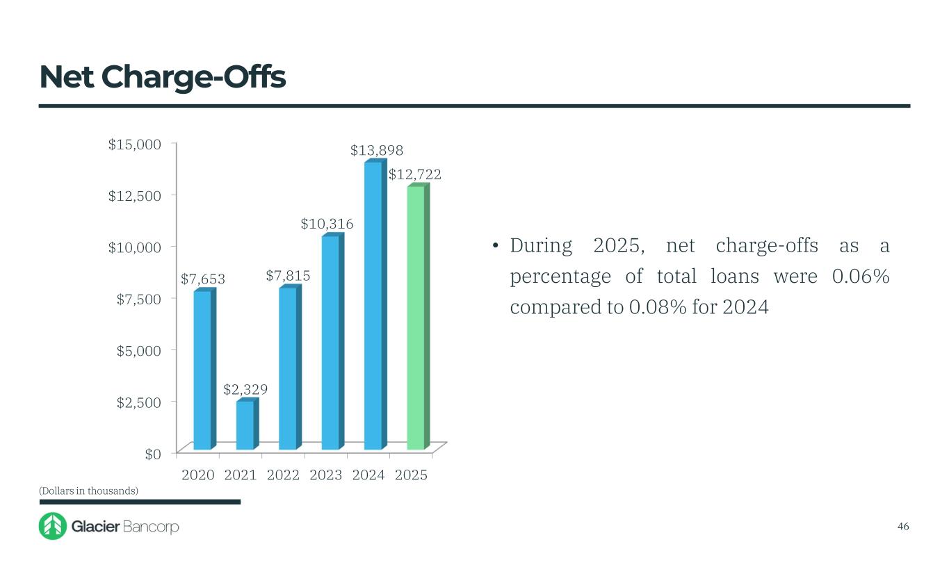 $0 $10,000 $20,000 $30,000 $40,000 $50,000 $60,000 $70,000 $80,000 2020 2021 2022 2023 2024 2025 $39,765 $23,076 $19,963 $14,795 $28,306 $71,400 • Loan portfolio growth, composition, average loan size, credit quality considerations, economic forecasts, actual results and other environmental factors will determine the future level of credit loss expense or benefit • Included in the current year provision for credit losses was $43.9 million from the acquisitions of Bank of Idaho and Guaranty Bank & Trust Provision For Credit Losses (Dollars in thousands) 45