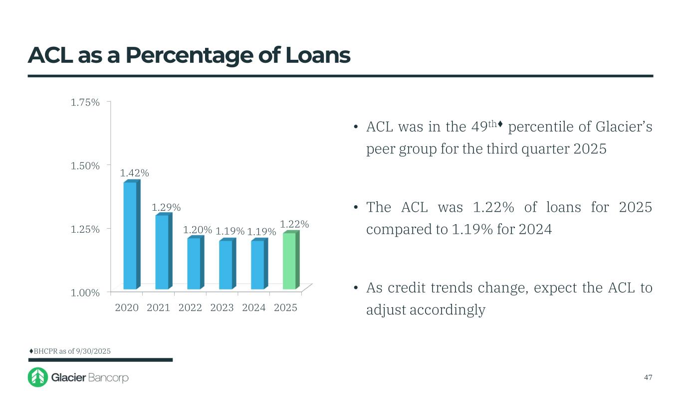 1.00% 1.25% 1.50% 1.75% 2020 2021 2022 2023 2024 2025 1.42% 1.29% 1.20% 1.19% 1.19% 1.22% • ACL was in the 49th percentile of Glacier’s peer group for the third quarter 2025 • The ACL was 1.22% of loans for 2025 compared to 1.19% for 2024 • As credit trends change, expect the ACL to adjust accordingly ACL as a Percentage of Loans BHCPR as of 9/30/2025 47