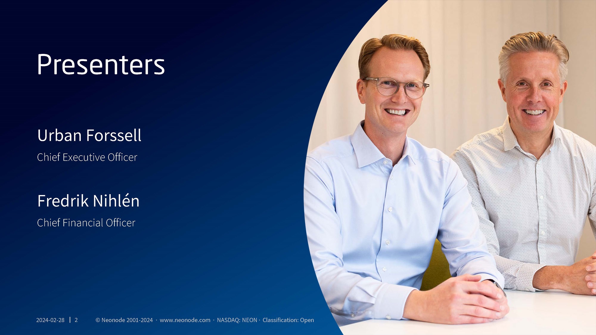 2024 - 02 - 27 2 © Neonode 2001 - 2024 · www.neonode.com · NASDAQ: NEON · Classification : Open Urban Forssell Chief Executive Officer Fredrik Nihlén Chief Financial Officer Presenters