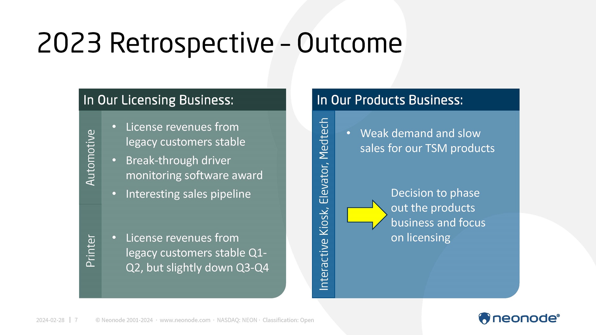 2024 - 02 - 27 7 © Neonode 2001 - 2024 · www.neonode.com · NASDAQ: NEON · Classification : Open 2023 Retrospective – Outcome In Our Licensing Business: • License revenues from legacy customers stable • Break - through driver monitoring software award • Interesting sales pipeline • License revenues from legacy customers stable Q1 - Q2, but slightly down Q3 - Q4 In Our Products Business: • Weak demand and slow sales for our TSM products Decision to phase out the products business and focus on licensing Printer Automotive Interactive Kiosk, Elevator, Medtech