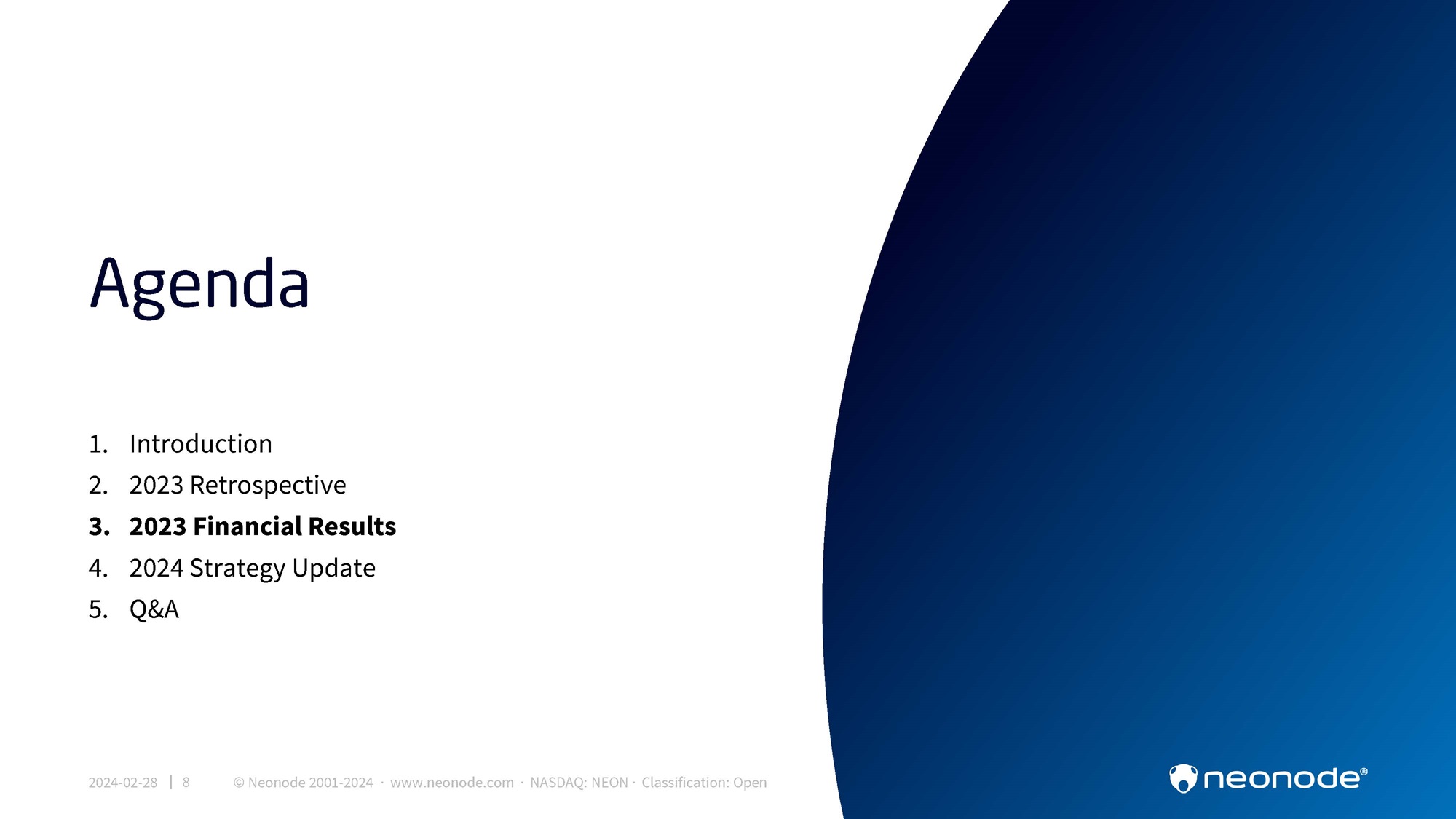 2024 - 02 - 27 8 © Neonode 2001 - 2024 · www.neonode.com · NASDAQ: NEON · Classification : Open Agenda 1. Introduction 2. 2023 Retrospective 3. 2023 Financial Results 4. 2024 Strategy Update 5. Q&A