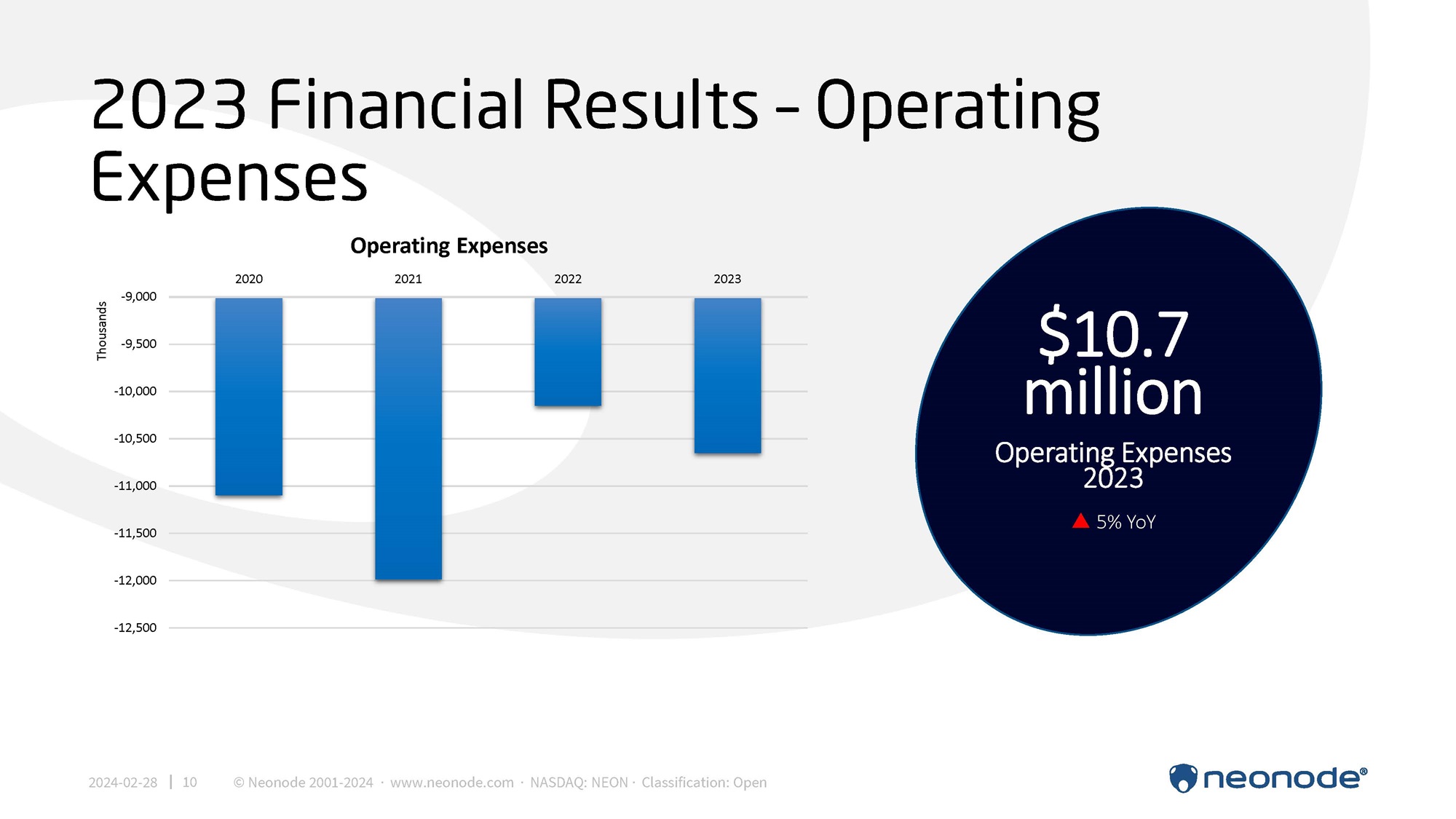 2024 - 02 - 27 9 © Neonode 2001 - 2024 · www.neonode.com · NASDAQ: NEON · Classification : Open 2023 Financial Results – Revenues $ 4 . 4 million Revenue Total 2023 ▼ 22 % YoY $0. 6 million Revenue Products 2023 ▼ 38 % YoY $ 3 . 8 million Revenue License 2023 ▼ 15 % YoY 0 500 1,000 1,500 2,000 2,500 3,000 3,500 AMER APAC EMEA AMER APAC EMEA AMER APAC EMEA AMER APAC EMEA 2020 2021 2022 2023 Thousands Revenues by Revenue Stream and Region License fees Products NRE 0 1,000 2,000 3,000 4,000 5,000 6,000 2020 2021 2022 2023 Thousands Revenues by Revenue Stream License fees Products NRE