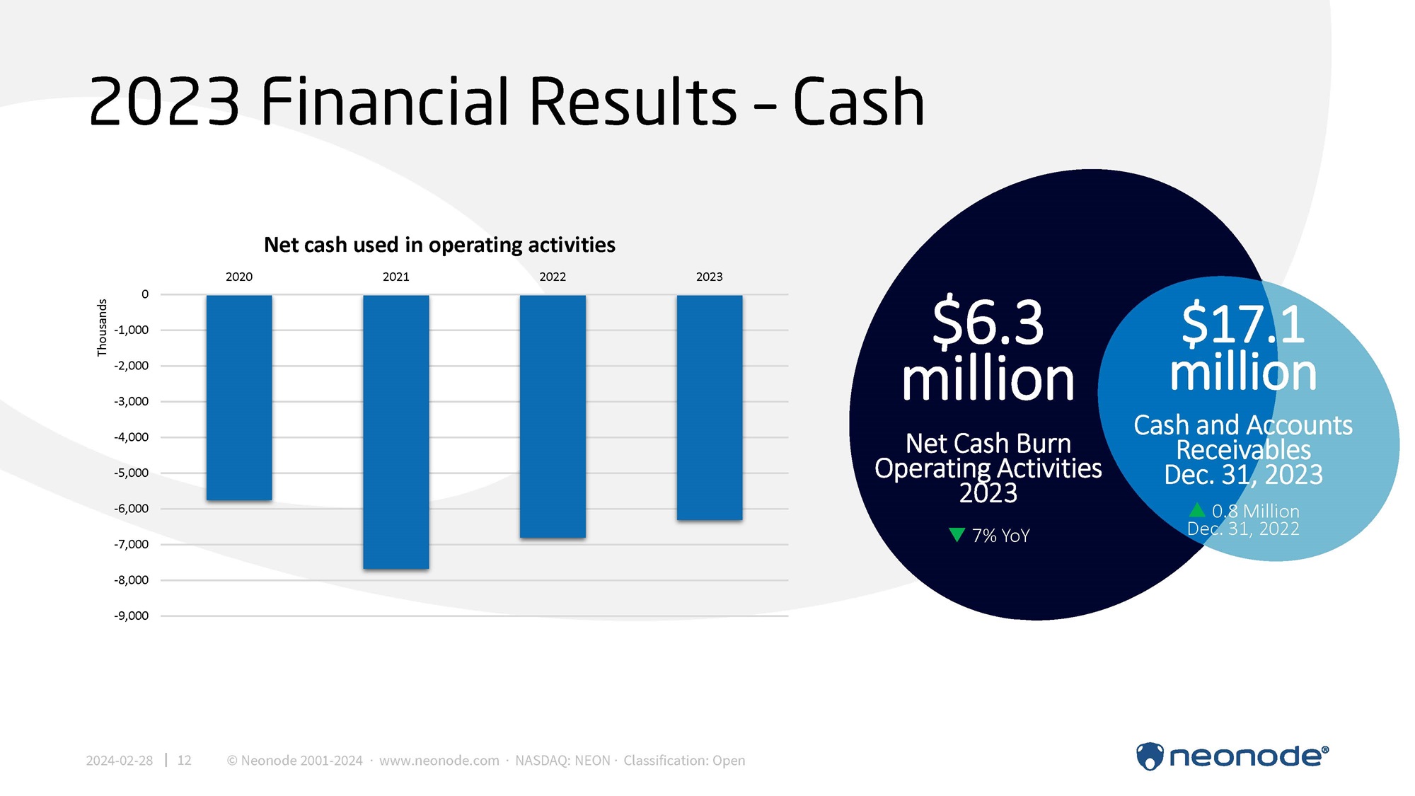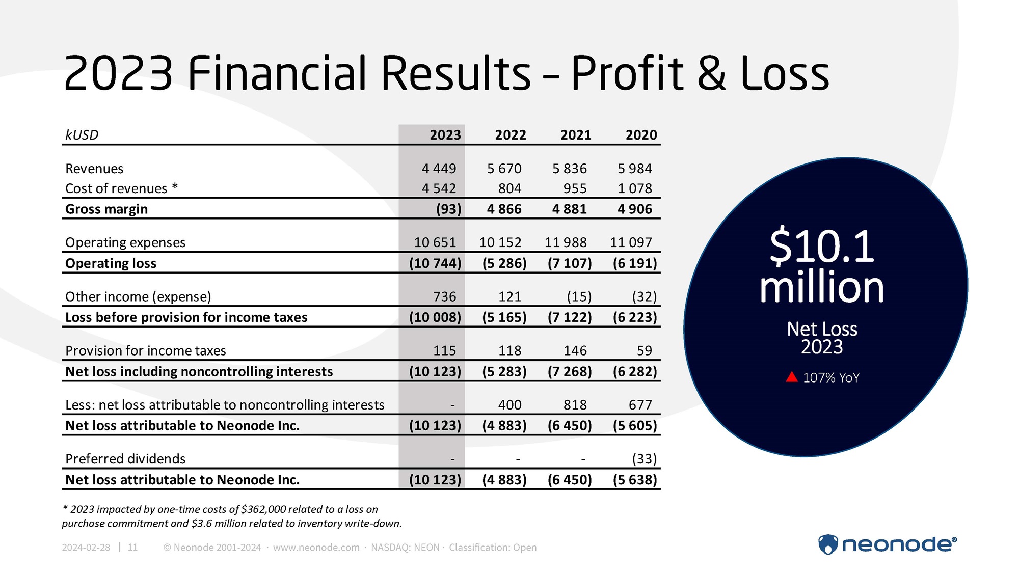 2024 - 02 - 27 11 © Neonode 2001 - 2024 · www.neonode.com · NASDAQ: NEON · Classification : Open 20 23 Financial Results – Profit & Loss $ 10.1 million Net Loss 2023 ▲ 103 % YoY * 2023 impacted by one - time costs of $362,000 related to a loss on purchase commitment and $3.6 million related to inventory write - down . kUSD 2023 2022 2021 2020 Revenues 4 449 5 670 5 836 5 984 Cost of revenues * 4 542 804 955 1 078 Gross margin (93) 4 866 4 881 4 906 Operating expenses 10 651 10 152 11 988 11 097 Operating loss (10 744) (5 286) (7 107) (6 191) Other income (expense) 736 121 (15) (32) Loss before provision for income taxes (10 008) (5 165) (7 122) (6 223) Provision for income taxes 115 118 146 59 Net loss including noncontrolling interests (10 123) (5 283) (7 268) (6 282) Less: net loss attributable to noncontrolling interests - 400 818 677 Net loss attributable to Neonode Inc. (10 123) (4 883) (6 450) (5 605) Preferred dividends - - - (33) Net loss attributable to Neonode Inc. (10 123) (4 883) (6 450) (5 638)