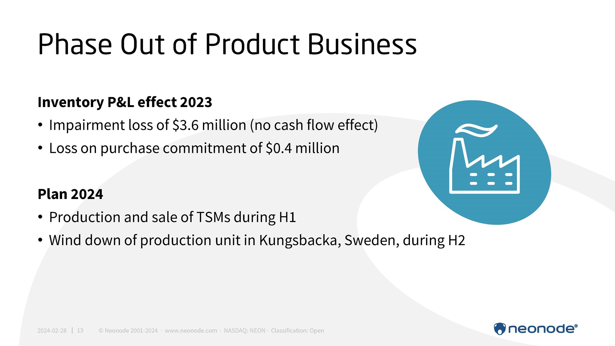 2024 - 02 - 27 13 © Neonode 2001 - 2024 · www.neonode.com · NASDAQ: NEON · Classification : Open Phase Out of Product Business Inventory P&L effect 2023 • Impairment loss of $3.6 million (no cash flow effect) • Loss on purchase commitment of $0.4 million Plan 2024 • Produc tion and sale of TSMs during H1 • Wind down of production unit in Kungsbacka , Sweden, during H2