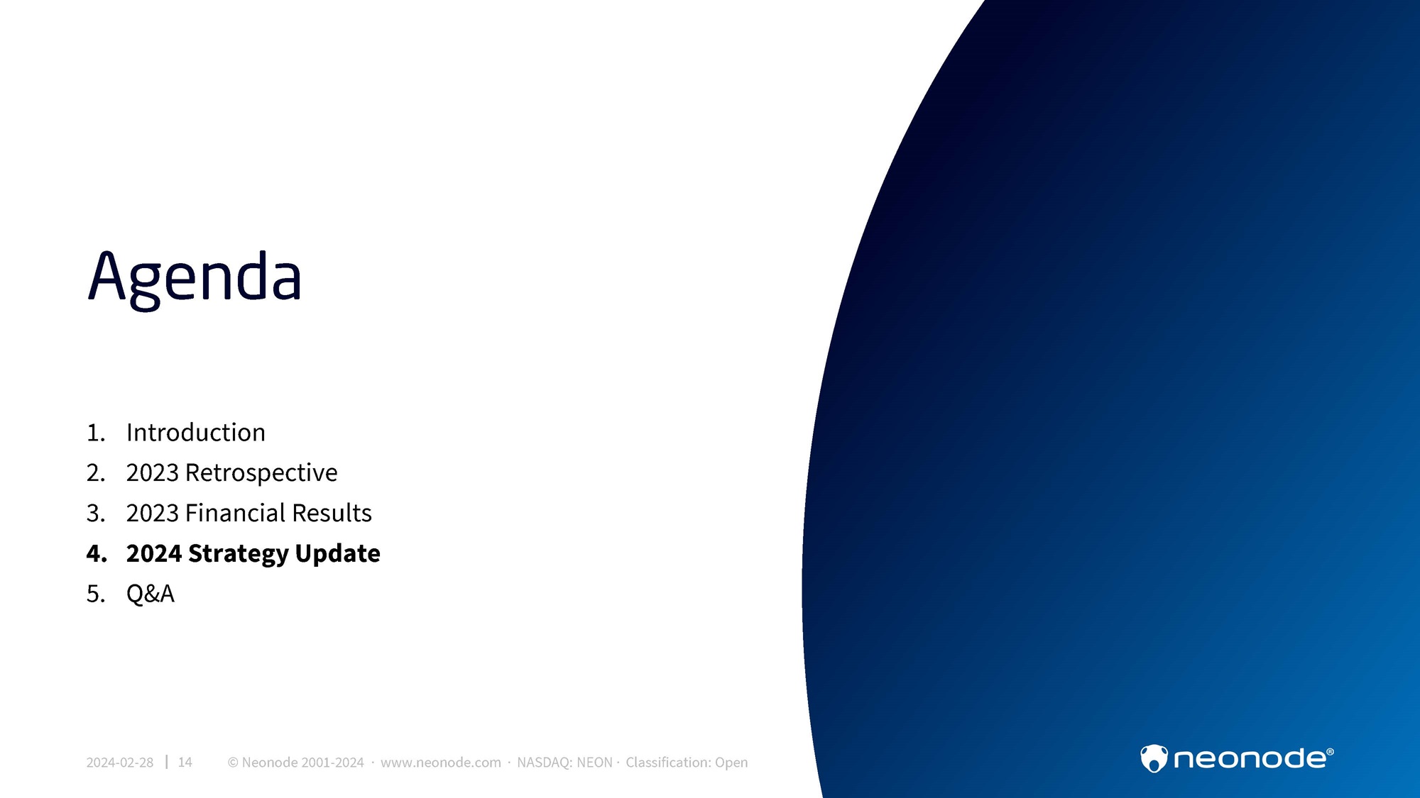 2024 - 02 - 27 14 © Neonode 2001 - 2024 · www.neonode.com · NASDAQ: NEON · Classification : Open Agenda 1. Introduction 2. 2023 Retrospective 3. 2023 Financial Results 4. 2024 Strategy Update 5. Q&A