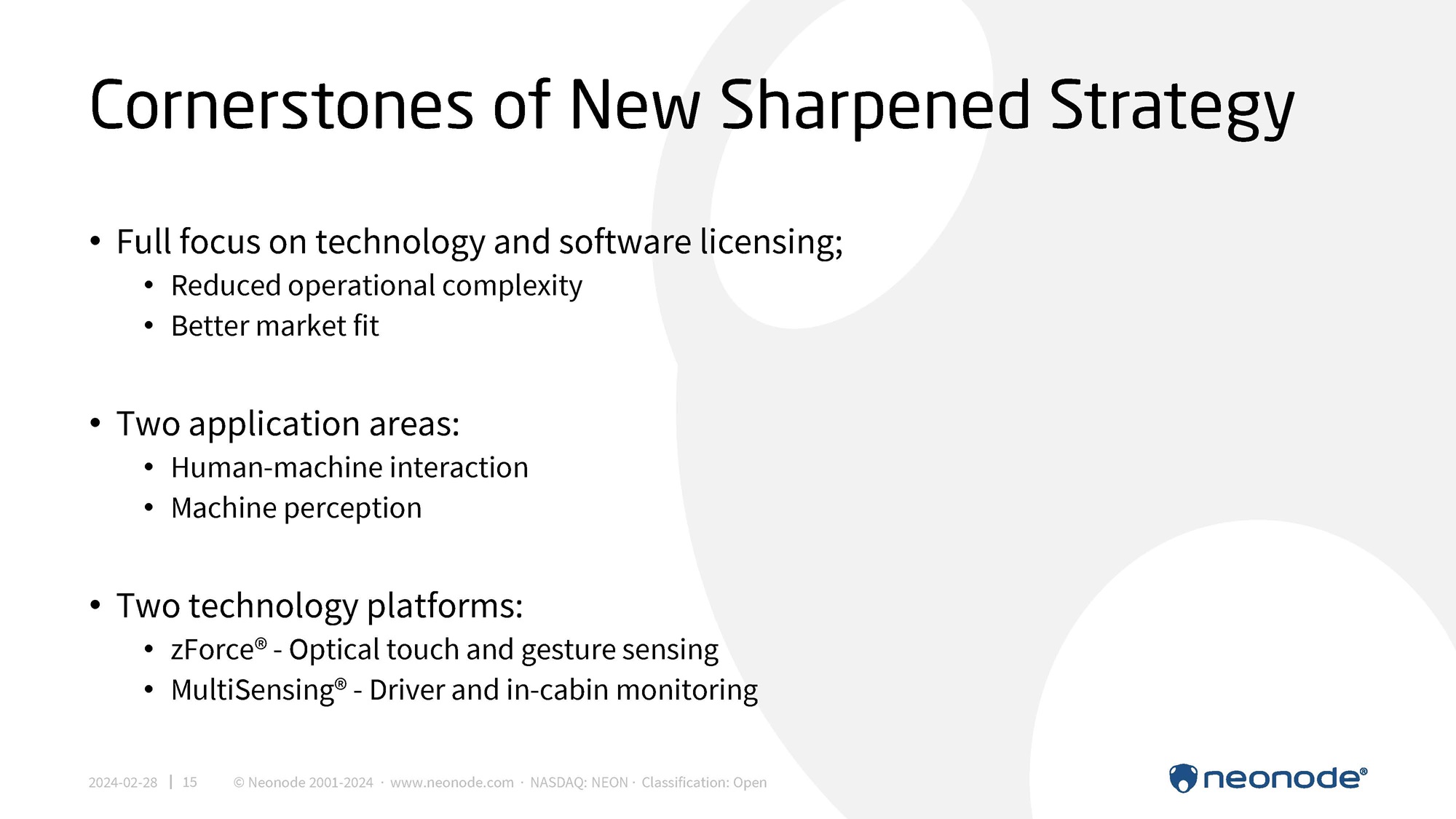 2024 - 02 - 27 15 © Neonode 2001 - 2024 · www.neonode.com · NASDAQ: NEON · Classification : Open Cornerstones of New Sharpened Strategy • Full focus on technology and software licensing ; • Reduced operational complexity • Better market fit • Two application areas: • Human - machine interaction • Machine perception • Two technology platforms : • zForce ® - Optical touch and gesture sensing • MultiSensing ® - Driver and in - cabin monitoring