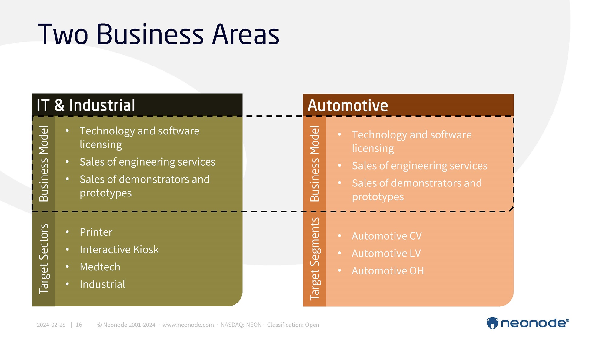 2024 - 02 - 27 16 © Neonode 2001 - 2024 · www.neonode.com · NASDAQ: NEON · Classification : Open Two Business Areas IT & Industrial • Technology and software licensing • Sales of engineering services • Sales of demonstrators and prototypes • Printer • Interactive Kiosk • Medtech • Industrial Automotive • Technology and software licensing • Sales of engineering services • Sales of demonstrators and prototypes • Automotive CV • Automotive LV • Automotive OH Target Sectors Business Model Target Segments Business Model