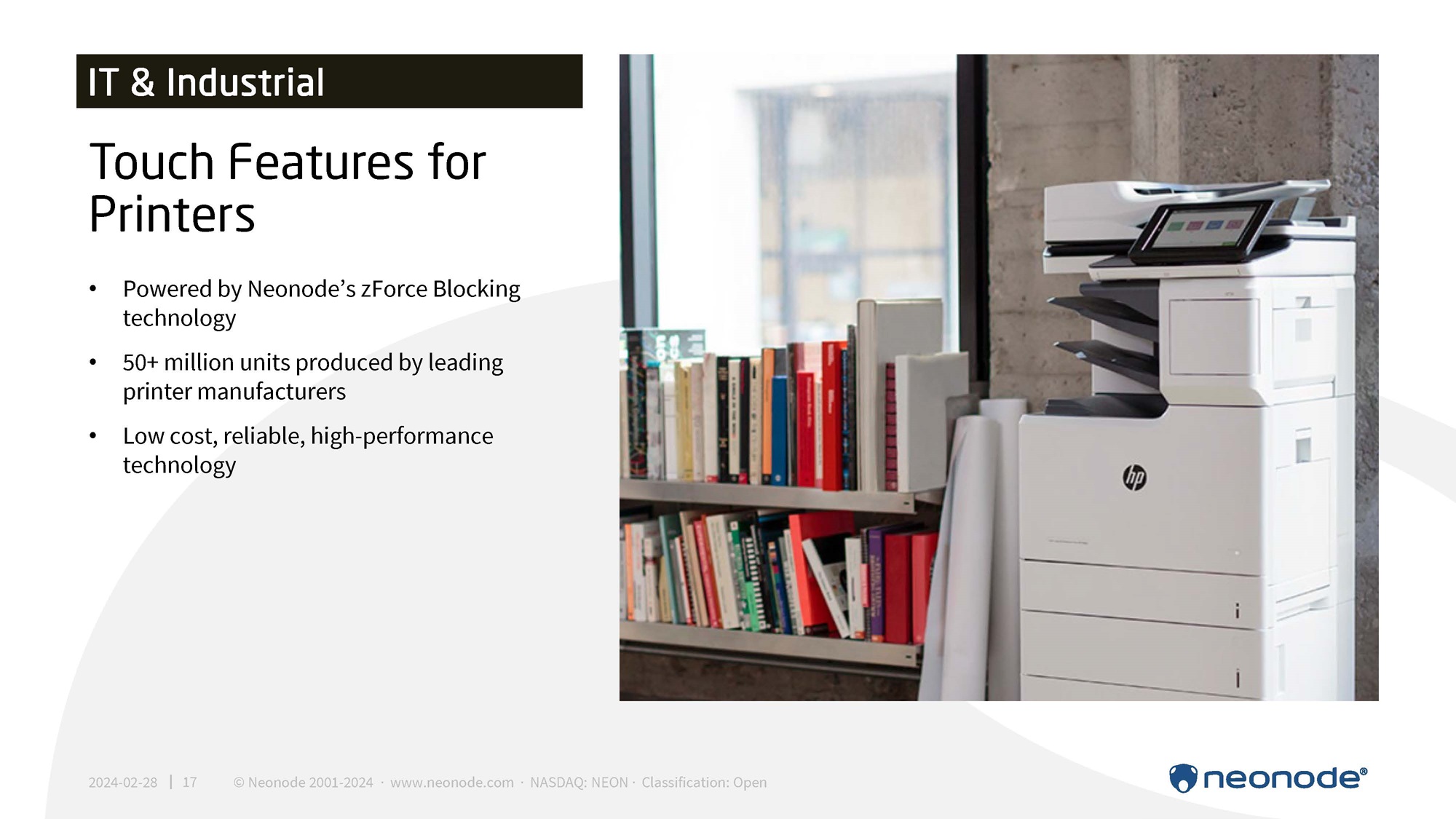 2024 - 02 - 27 17 © Neonode 2001 - 2024 · www.neonode.com · NASDAQ: NEON · Classification : Open Touch Features for Printers • Powered by Neonode’s zForce Blocking technology • 50+ million units produced by leading printer manufacturers • Low cost, reliable, high - performance technology IT & Industrial