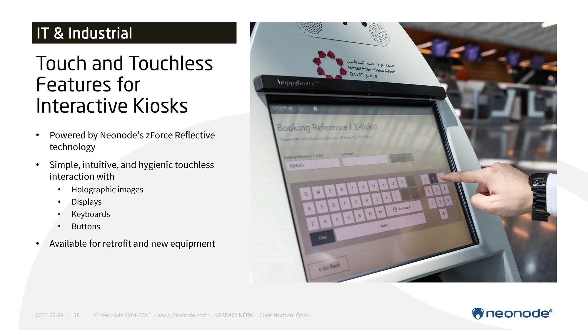 2024 - 02 - 27 18 © Neonode 2001 - 2024 · www.neonode.com · NASDAQ: NEON · Classification : Open Touch and Touchless Features for Interactive Kiosks • Powered by Neonode’s zForce Reflective technology • Simple, intuitive, and hygienic touchless interaction with • Holographic images • Displays • Keyboards • Buttons • Available for retrofit and new equipment IT & Industrial