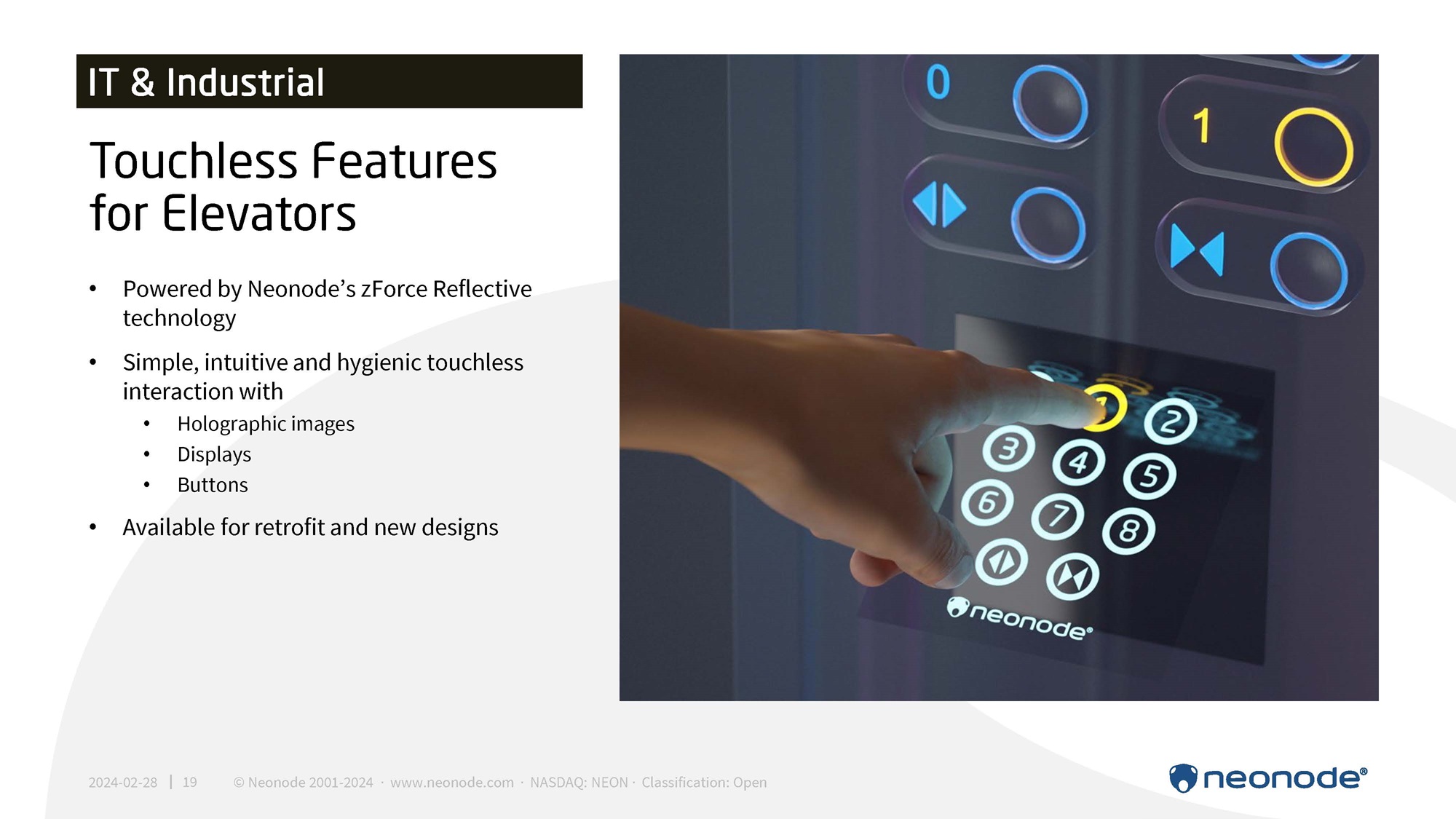 2024 - 02 - 27 19 © Neonode 2001 - 2024 · www.neonode.com · NASDAQ: NEON · Classification : Open Touchless Features for Elevators • Powered by Neonode’s zForce Reflective technology • Simple, intuitive and hygienic touchless interaction with • Holographic images • Displays • Buttons • Available for retrofit and new designs IT & Industrial