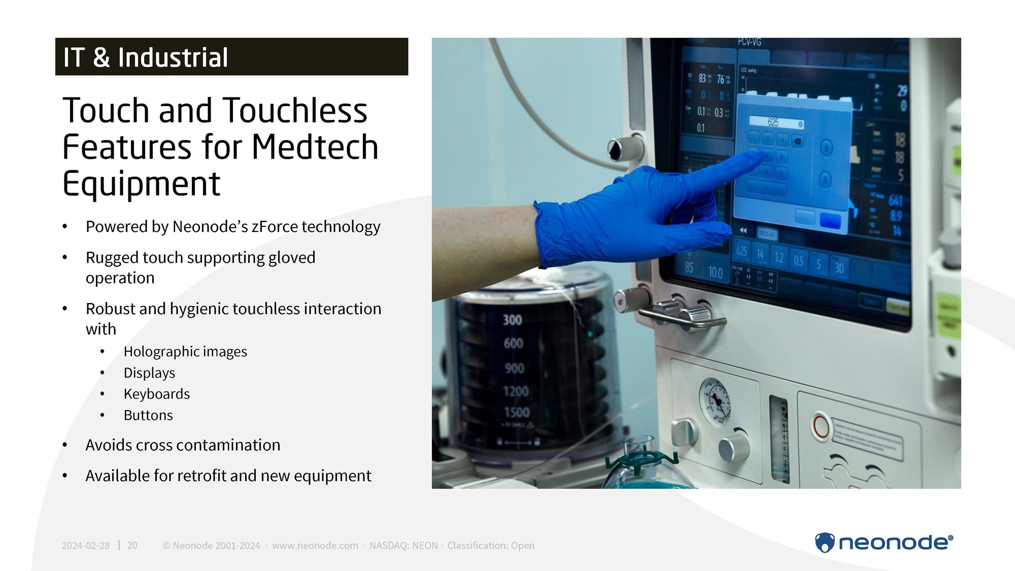 2024 - 02 - 27 20 © Neonode 2001 - 2024 · www.neonode.com · NASDAQ: NEON · Classification : Open Touch and Touchless Features for Medtech Equipment • Powered by Neonode’s zForce technology • Rugged touch supporting gloved operation • Robust and hygienic touchless interaction with • Holographic images • Displays • Keyboards • Buttons • Avoids cross contamination • Available for retrofit and new equipment IT & Industrial
