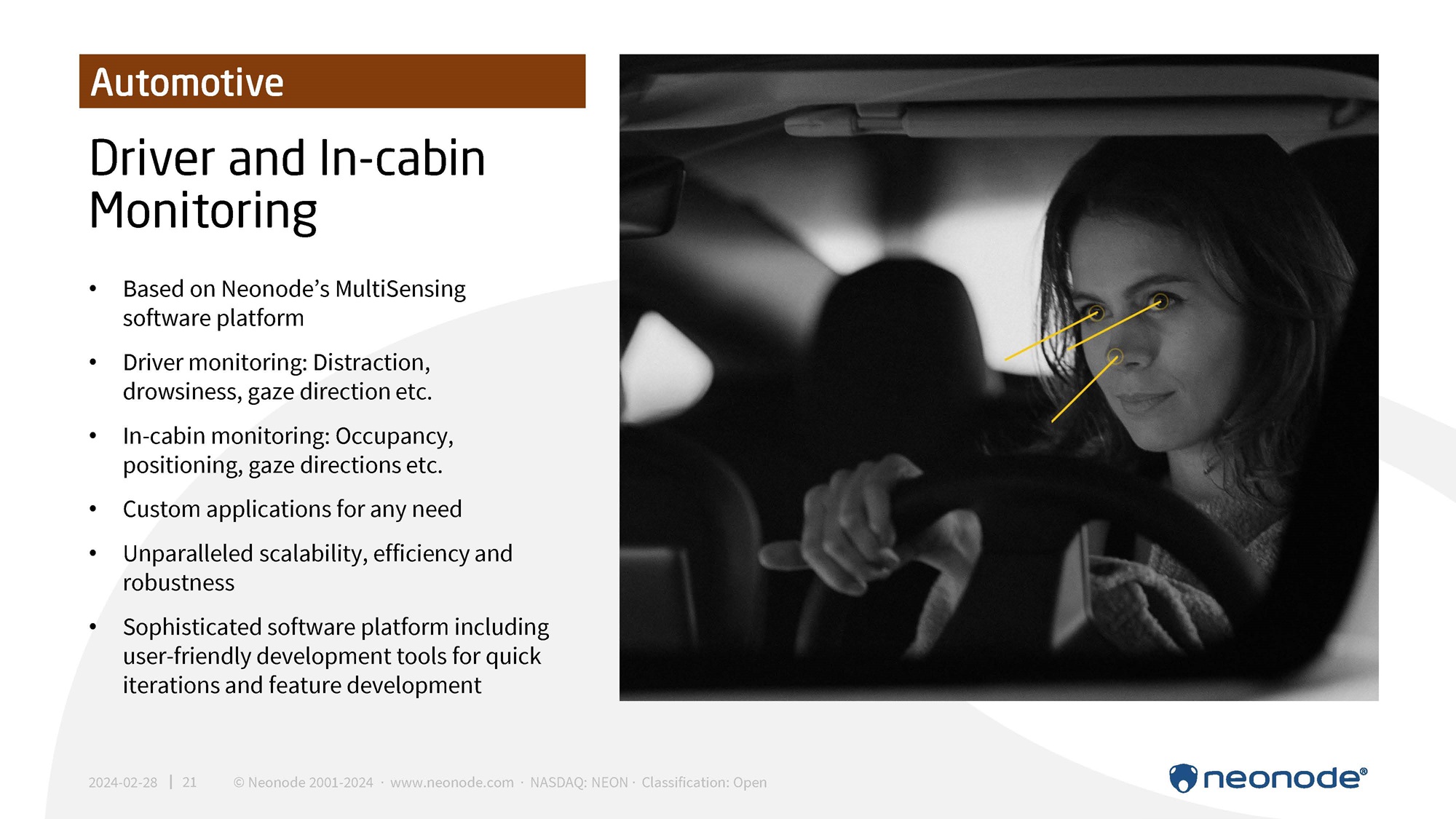 2024 - 02 - 27 21 © Neonode 2001 - 2024 · www.neonode.com · NASDAQ: NEON · Classification : Open Driver and In - cabin Monitoring • Based on Neonode’s MultiSensing software platform • Driver monitoring : Distraction , drowsiness , gaze direction etc. • In - cabin monitoring : Occupancy , positioning , gaze directions etc. • Custom applications for any need • Unparalleled scalability , efficiency and robustness • Sophisticated software platform including user - friendly development tools for quick iterations and feature development Automotive