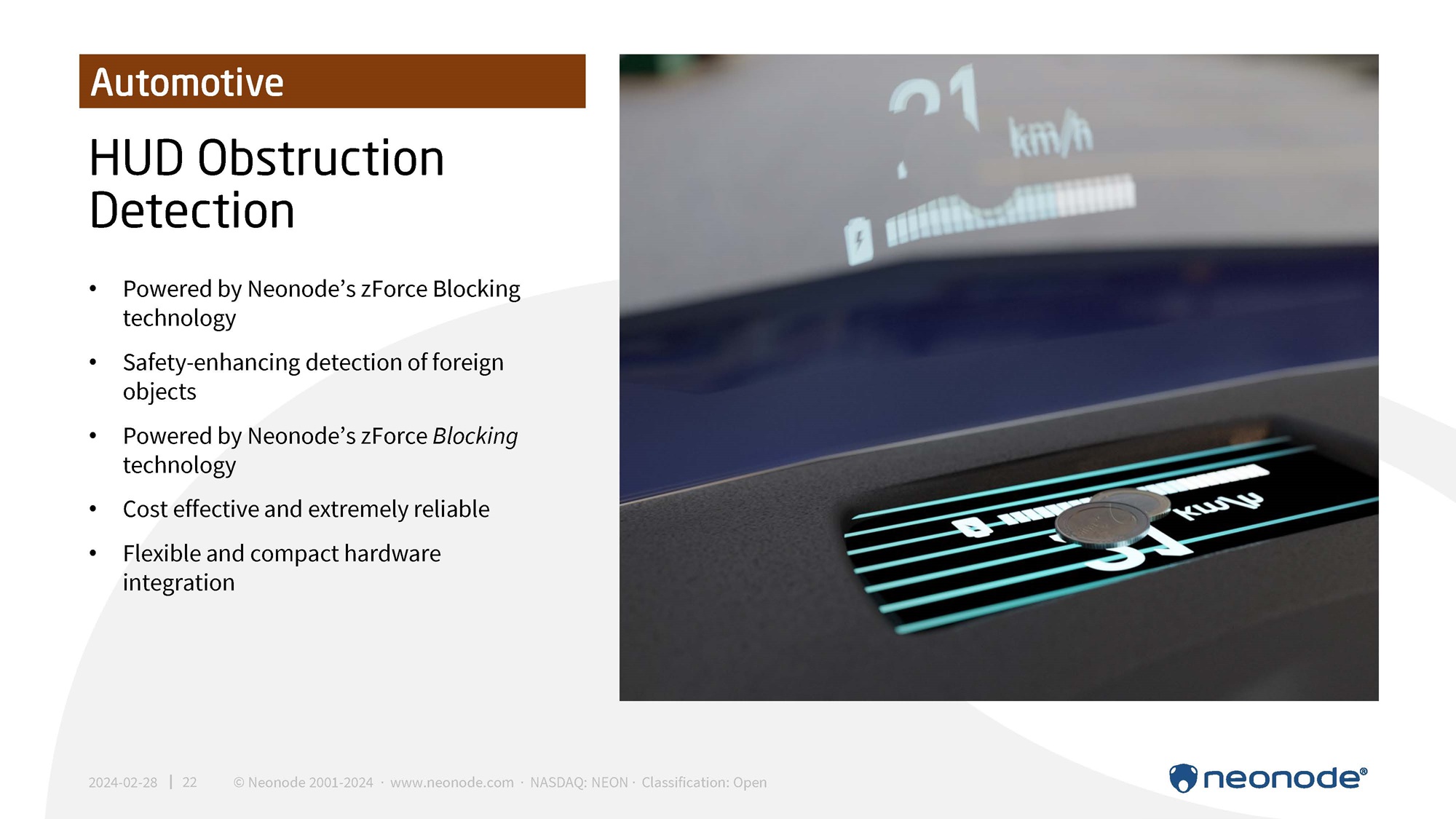 2024 - 02 - 27 22 © Neonode 2001 - 2024 · www.neonode.com · NASDAQ: NEON · Classification : Open HUD Obstruction Detection • Powered by Neonode’s zForce Blocking technology • Safety - enhancing detection of foreign objects • Powered by Neonode’s zForce Blocking technology • Cost effective and extremely reliable • Flexible and compact hardware integration Automotive
