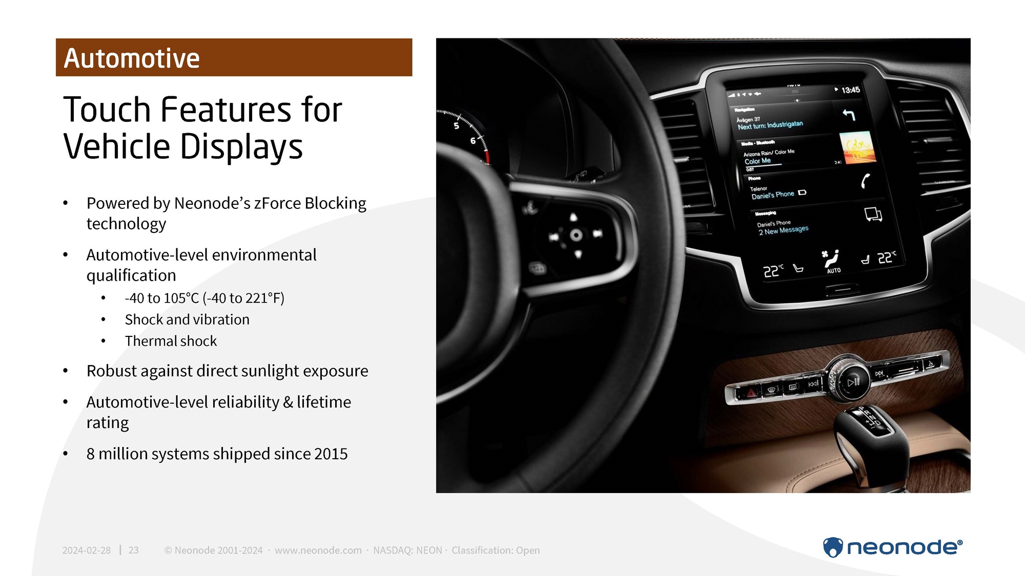 2024 - 02 - 27 23 © Neonode 2001 - 2024 · www.neonode.com · NASDAQ: NEON · Classification : Open Touch Features for Vehicle Displays • Powered by Neonode’s zForce Blocking technology • Automotive - level environmental qualification • - 40 to 105 ° C ( - 40 to 221 ° F) • Shock and vibration • Thermal shock • Robust against direct sunlight exposure • Automotive - level reliability & lifetime rating • 8 million systems shipped since 2015 Automotive