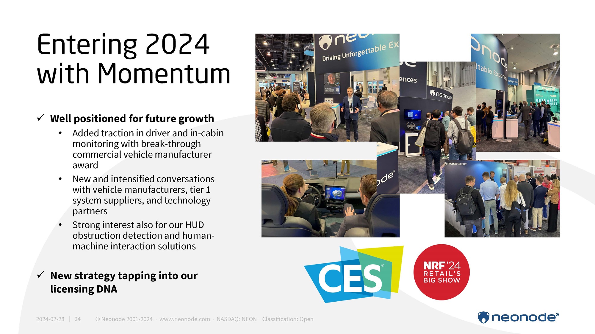 2024 - 02 - 27 24 © Neonode 2001 - 2024 · www.neonode.com · NASDAQ: NEON · Classification : Open x Well positioned for future growth • Added traction in driver and in - cabin monitoring with break - through commercial vehicle manufacturer award • New and intensified conversations with vehicle manufacturers , tier 1 system suppliers , and technology partners • Strong interest also for our HUD obstruction detection and human - machine interaction solutions x New strategy tapping into our licensing DNA Entering 2024 with Momentum