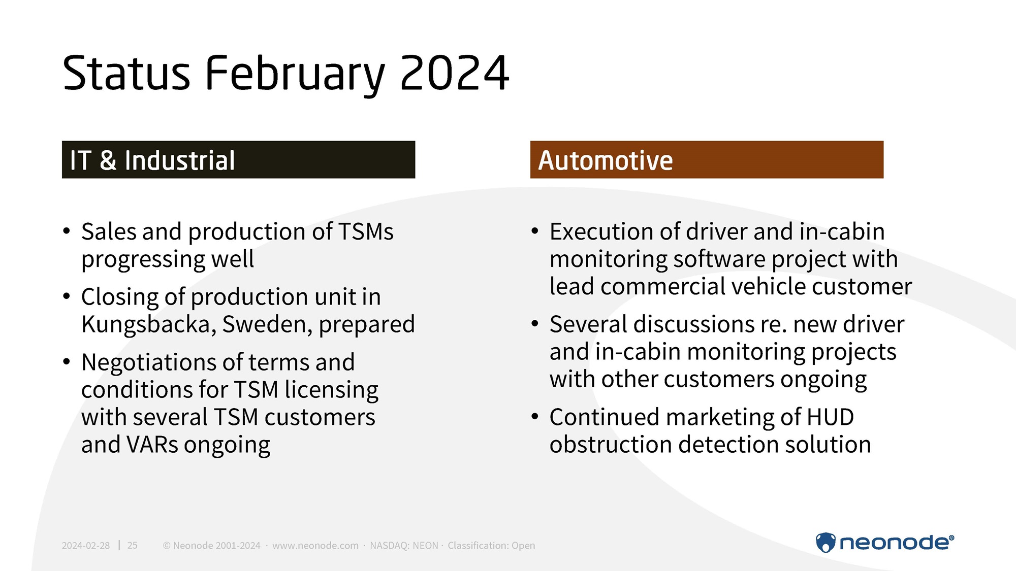2024 - 02 - 27 25 © Neonode 2001 - 2024 · www.neonode.com · NASDAQ: NEON · Classification : Open • Sales and production of TSMs progressing well • Closing of production unit in Kungsbacka, Sweden, prepared • Negotiations of terms and conditions for TSM licensing with several TSM customers and VARs ongoing • Execution of driver and in - cabin monitoring software project with lead commercial vehicle customer • Several discussions re. new driver and in - cabin monitoring projects with other customers ongoing • Continued marketing of HUD obstruction detection solution Status February 2024 Automotive IT & Industrial