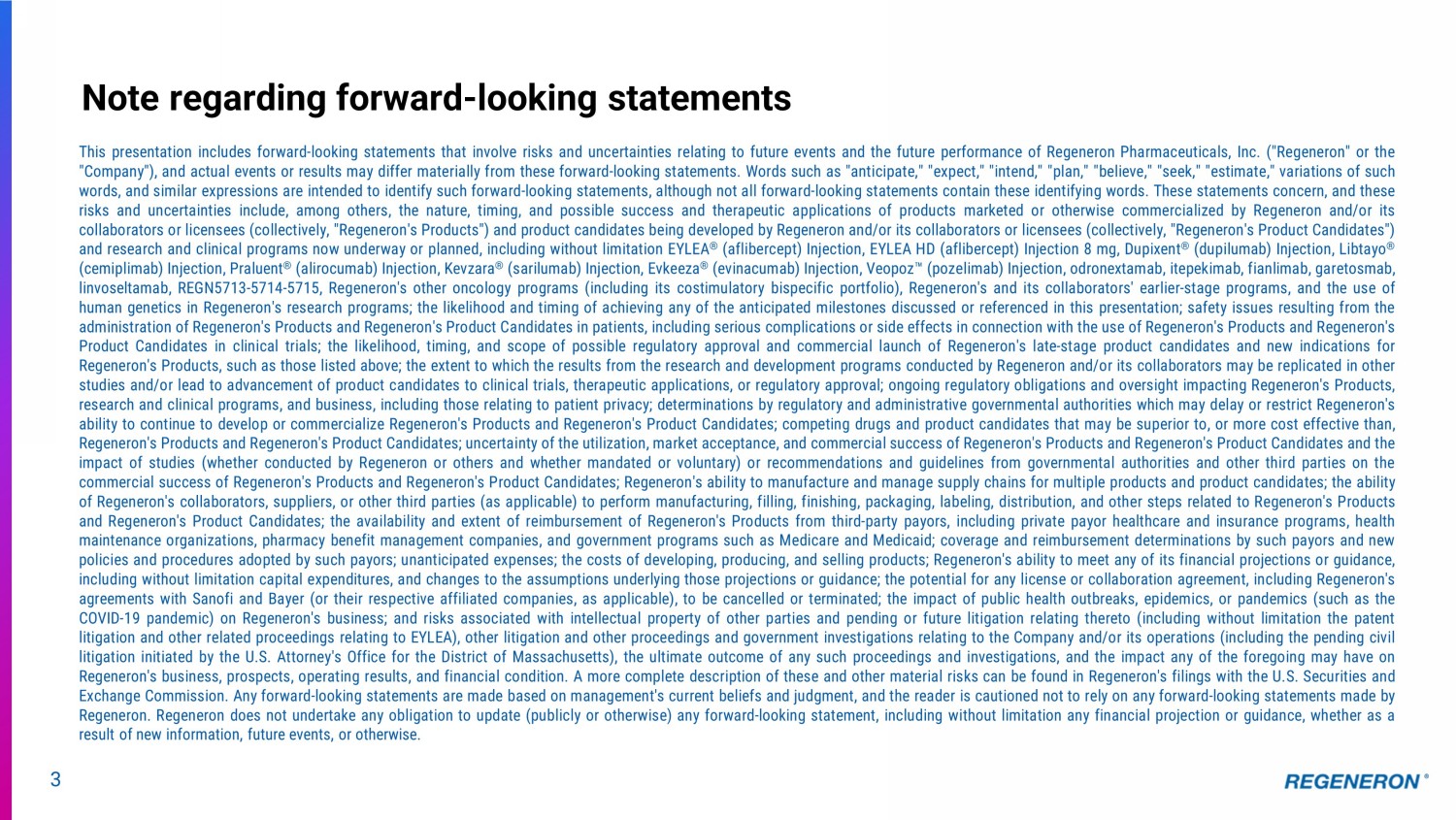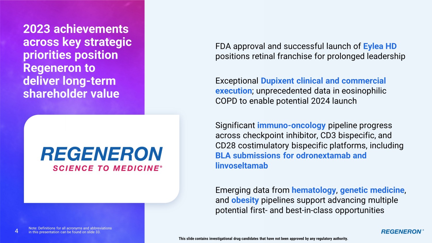 3 Note regarding forward - looking statements This presentation includes forward - looking statements that involve risks and uncertainties relating to future events and the future performance of Regeneron Pharmaceuticals, Inc . ("Regeneron" or the "Company"), and actual events or results may differ materially from these forward - looking statements . Words such as "anticipate," "expect," "intend," "plan," "believe," "seek," "estimate," variations of such words, and similar expressions are intended to identify such forward - looking statements, although not all forward - looking statements contain these identifying words . These statements concern, and these risks and uncertainties include, among others, the nature, timing, and possible success and therapeutic applications of products marketed or otherwise commercialized by Regeneron and/or its collaborators or licensees (collectively, "Regeneron's Products") and product candidates being developed by Regeneron and/or its collaborators or licensees (collectively, "Regeneron's Product Candidates") and research and clinical programs now underway or planned, including without limitation EYLEA ® (aflibercept) Injection, EYLEA HD (aflibercept) Injection 8 mg, Dupixent ® (dupilumab) Injection, Libtayo ® (cemiplimab) Injection, Praluent ® (alirocumab) Injection, Kevzara ® (sarilumab) Injection, Evkeeza ® (evinacumab) Injection, Veopoz Ӵ (pozelimab) Injection, odronextamab, itepekimab, fianlimab, garetosmab, linvoseltamab, REGN 5713 - 5714 - 5715 , Regeneron's other oncology programs (including its costimulatory bispecific portfolio), Regeneron's and its collaborators' earlier - stage programs, and the use of human genetics in Regeneron's research programs ; the likelihood and timing of achieving any of the anticipated milestones discussed or referenced in this presentation ; safety issues resulting from the administration of Regeneron's Products and Regeneron's Product Candidates in patients, including serious complications or side effects in connection with the use of Regeneron's Products and Regeneron's Product Candidates in clinical trials ; the likelihood, timing, and scope of possible regulatory approval and commercial launch of Regeneron's late - stage product candidates and new indications for Regeneron's Products, such as those listed above ; the extent to which the results from the research and development programs conducted by Regeneron and/or its collaborators may be replicated in other studies and/or lead to advancement of product candidates to clinical trials, therapeutic applications, or regulatory approval ; ongoing regulatory obligations and oversight impacting Regeneron's Products, research and clinical programs, and business, including those relating to patient privacy ; determinations by regulatory and administrative governmental authorities which may delay or restrict Regeneron's ability to continue to develop or commercialize Regeneron's Products and Regeneron's Product Candidates ; competing drugs and product candidates that may be superior to, or more cost effective than, Regeneron's Products and Regeneron's Product Candidates ; uncertainty of the utilization, market acceptance, and commercial success of Regeneron's Products and Regeneron's Product Candidates and the impact of studies (whether conducted by Regeneron or others and whether mandated or voluntary) or recommendations and guidelines from governmental authorities and other third parties on the commercial success of Regeneron's Products and Regeneron's Product Candidates ; Regeneron's ability to manufacture and manage supply chains for multiple products and product candidates ; the ability of Regeneron's collaborators, suppliers, or other third parties (as applicable) to perform manufacturing, filling, finishing, packaging, labeling, distribution, and other steps related to Regeneron's Products and Regeneron's Product Candidates ; the availability and extent of reimbursement of Regeneron's Products from third - party payors, including private payor healthcare and insurance programs, health maintenance organizations, pharmacy benefit management companies, and government programs such as Medicare and Medicaid ; coverage and reimbursement determinations by such payors and new policies and procedures adopted by such payors ; unanticipated expenses ; the costs of developing, producing, and selling products ; Regeneron's ability to meet any of its financial projections or guidance, including without limitation capital expenditures, and changes to the assumptions underlying those projections or guidance ; the potential for any license or collaboration agreement, including Regeneron's agreements with Sanofi and Bayer (or their respective affiliated companies, as applicable), to be cancelled or terminated ; the impact of public health outbreaks, epidemics, or pandemics (such as the COVID - 19 pandemic) on Regeneron's business ; and risks associated with intellectual property of other parties and pending or future litigation relating thereto (including without limitation the patent litigation and other related proceedings relating to EYLEA), other litigation and other proceedings and government investigations relating to the Company and/or its operations (including the pending civil litigation initiated by the U . S . Attorney's Office for the District of Massachusetts), the ultimate outcome of any such proceedings and investigations, and the impact any of the foregoing may have on Regeneron's business, prospects, operating results, and financial condition . A more complete description of these and other material risks can be found in Regeneron's filings with the U . S . Securities and Exchange Commission . Any forward - looking statements are made based on management's current beliefs and judgment, and the reader is cautioned not to rely on any forward - looking statements made by Regeneron . Regeneron does not undertake any obligation to update (publicly or otherwis