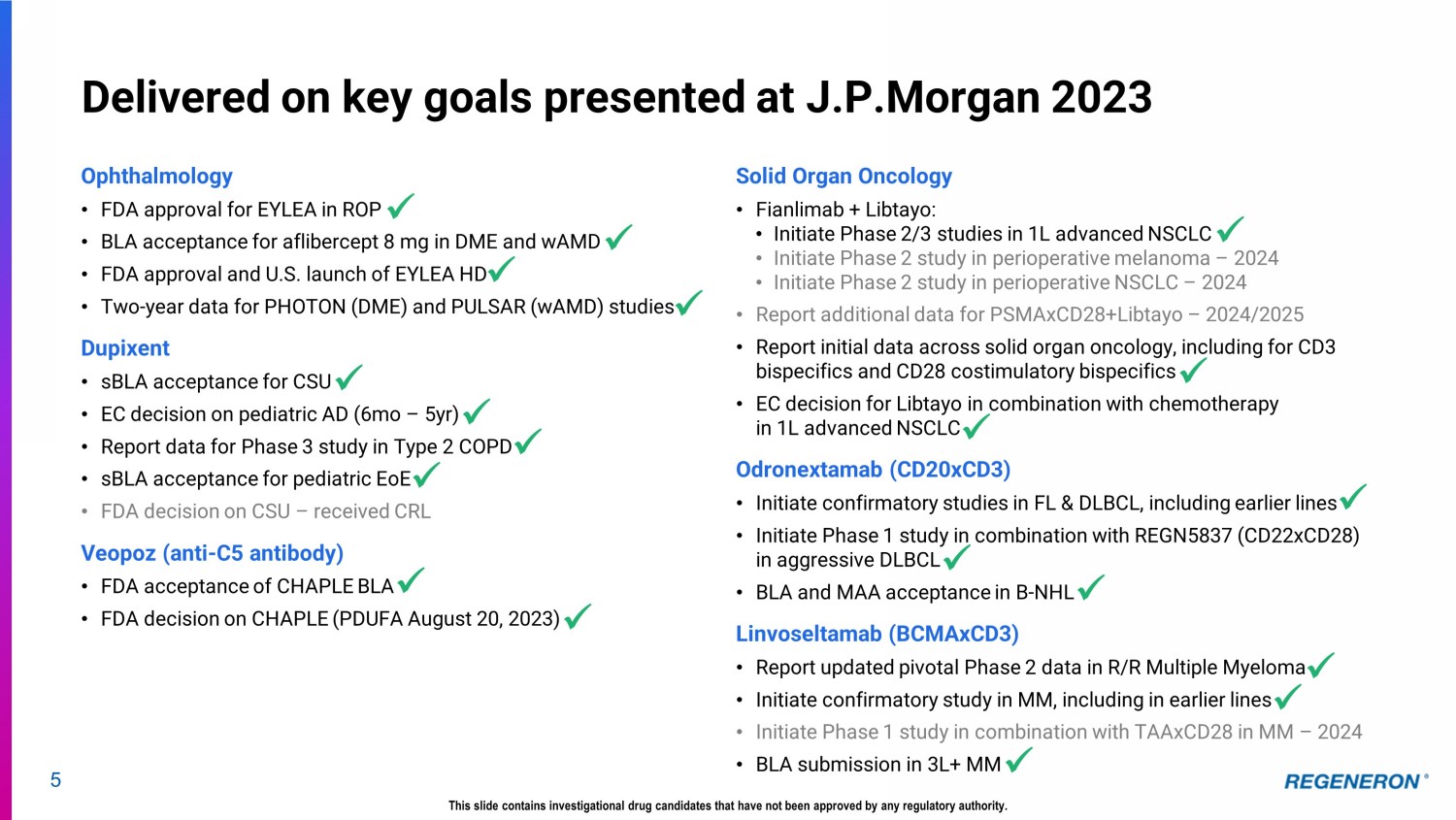 4 2023 achievements across key strategic priorities position Regeneron to deliver long - term shareholder value This slide contains investigational drug candidates that have not been approved by any regulatory authority. Note: Definitions for all acronyms and abbreviations in this presentation can be found on slide 33. FDA approval and successful launch of Eylea HD positions retinal franchise for prolonged leadership Exceptional Dupixent clinical and commercial execution ; unprecedented data in eosinophilic COPD to enable potential 2024 launch Significant immuno - oncology pipeline progress across checkpoint inhibitor, CD3 bispecific, and CD28 costimulatory bispecific platforms, including BLA submissions for odronextamab and linvoseltamab Emerging data from hematology , genetic medicine , and obesity pipelines support advancing multiple potential first - and best - in - class opportunities