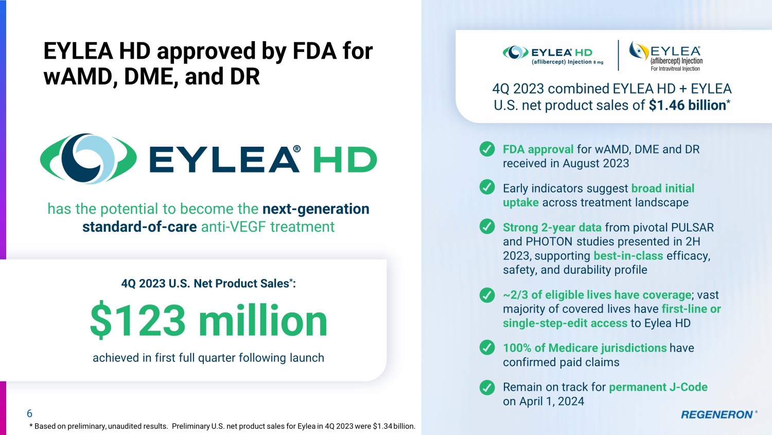 Solid Organ Oncology • Fianlimab + Libtayo: • Initiate Phase 2/3 studies in 1L advanced NSCLC • Initiate Phase 2 study in perioperative melanoma – 2024 • Initiate Phase 2 study in perioperative NSCLC – 2024 • Report additional data for PSMAxCD28+Libtayo – 2024/ 2025 • Report initial data across solid organ oncology, including for CD3 bispecifics and CD28 costimulatory bispecifics • EC decision for Libtayo in combination with chemotherapy in 1L advanced NSCLC Odronextamab (CD20xCD3) • Initiate confirmatory studies in FL & DLBCL, including earlier lines • Initiate Phase 1 study in combination with REGN5837 (CD22xCD28) in aggressive DLBCL • BLA and MAA acceptance in B - NHL Linvoseltamab (BCMAxCD3) • Report updated pivotal Phase 2 data in R/R Multiple Myeloma • Initiate confirmatory study in MM, including in earlier lines • Initiate Phase 1 study in combination with TAAxCD28 in MM – 2024 • BLA submission in 3L+ MM x x x x x x x x x 5 Delivered on key goals presented at J.P.Morgan 2023 This slide contains investigational drug candidates that have not been approved by any regulatory authority. Ophthalmology • FDA approval for EYLEA in ROP • BLA acceptance for aflibercept 8 mg in DME and wAMD • FDA approval and U.S. launch of EYLEA HD • Two - year data for PHOTON (DME) and PULSAR (wAMD) studies Dupixent • sBLA acceptance for CSU • EC decision on pediatric AD (6mo – 5yr) • Report data for Phase 3 study in Type 2 COPD • sBLA acceptance for pediatric EoE • FDA decision on CSU – received CRL Veopoz (anti - C5 antibody) • FDA acceptance of CHAPLE BLA • FDA decision on CHAPLE (PDUFA August 20, 2023) x x x x x x x x x x