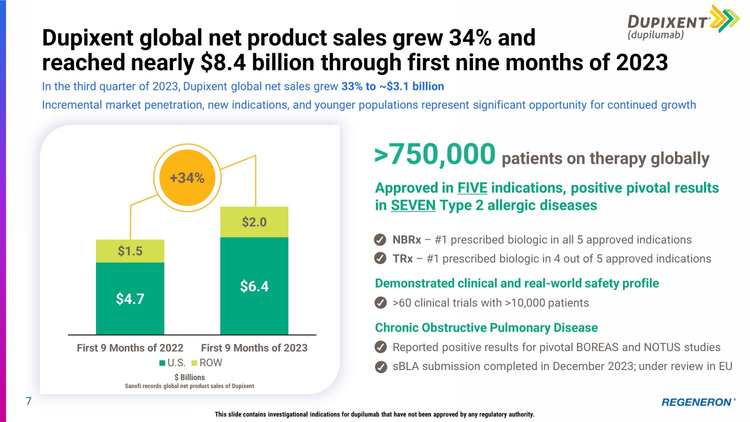 6 EYLEA HD approved by FDA for wAMD, DME, and DR has the potential to become the next - generation standard - of - care anti - VEGF treatment 4Q 2023 U.S. Net Product Sales * : $123 million achieved in first full quarter following launch FDA approval for wAMD, DME and DR received in August 2023 Early indicators suggest broad initial uptake across treatment landscape Strong 2 - year data from pivotal PULSAR and PHOTON studies presented in 2H 2023, supporting best - in - class efficacy, safety, and durability profile ~2/3 of eligible lives have coverage ; vast majority of covered lives have first - line or single - step - edit access to Eylea HD 100% of Medicare jurisdictions have confirmed paid claims Re main on track for permanent J - Code on April 1, 2024 * Based on preliminary, unaudited results. Preliminary U.S. net product sales for Eylea in 4Q 2023 were $1.34 billion. 4Q 2023 combined EYLEA HD + EYLEA U.S. net product sales of $1.46 billion *