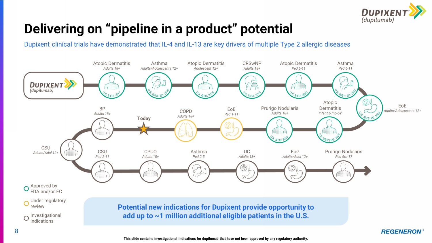 7 Dupixent global net product sales grew 34% and reached nearly $8.4 billion through first nine months of 2023 In the third quarter of 2023, Dupixent global net sales grew 33% to ~$3.1 billion Incremental market penetration, new indications, and younger populations represent significant opportunity for continued grow th $4.7 $6.4 $1.5 $2.0 First 9 Months of 2022 First 9 Months of 2023 U.S. ROW +34% $ Billions Sanofi records global net product sales of Dupixent This slide contains investigational indications for dupilumab that have not been approved by any regulatory authority. Approved in FIVE indications, positive pivotal results in SEVEN Type 2 allergic diseases NBRx – #1 prescribed biologic in all 5 approved indications TRx – #1 prescribed biologic in 4 out of 5 approved indications Demonstrated clinical and real - world safety profile >60 clinical trials with >10,000 patients Chronic Obstructive Pulmonary Disease Reported positive results for pivotal BOREAS and NOTUS studies sBLA submission completed in December 2023; under review in EU >750,000 patients on therapy globally