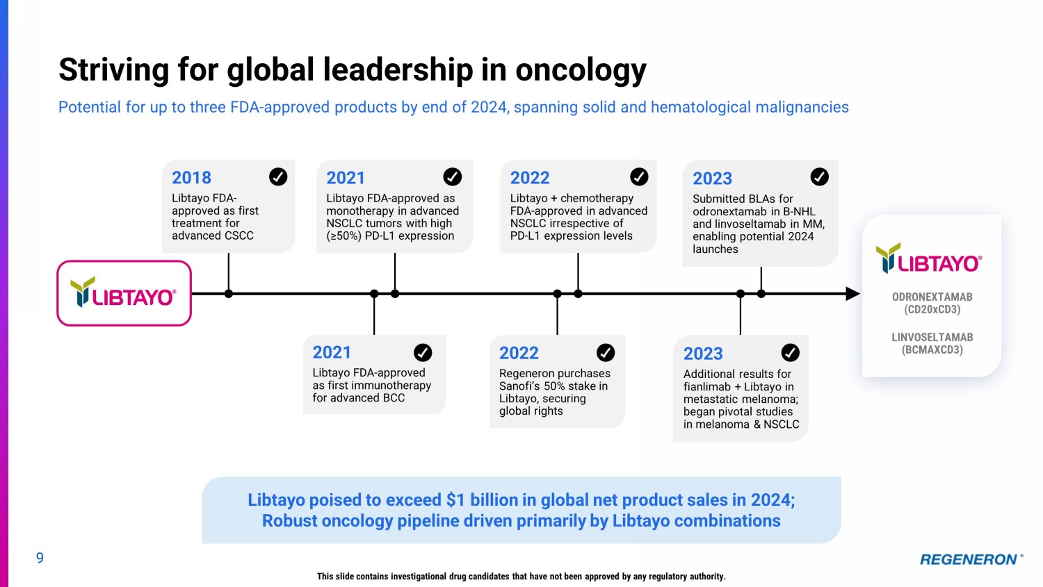 9 Striving for global leadership in oncology Potential for up to three FDA - approved products by end of 2024, spanning solid and hematological malignancies Libtayo poised to exceed $1 billion in global net product sales in 2024; Robust oncology pipeline driven primarily by Libtayo combinations 2018 Libtayo FDA - approved as first treatment for advanced CSCC 2023 Submitted BLAs for odronextamab in B - NHL and linvoseltamab in MM, enabling potential 2024 launches 2023 Additional results for fianlimab + Libtayo in metastatic melanoma; began pivotal studies in melanoma & NSCLC 2022 Libtayo + chemotherapy FDA - approved in advanced NSCLC irrespective of PD - L1 expression levels 2022 Regeneron purchases Sanofi’s 50% stake in Libtayo, securing global rights 2021 Libtayo FDA - approved as monotherapy in advanced NSCLC tumors with high (≥50%) PD - L1 expression 2021 Libtayo FDA - approved as first immunotherapy for advanced BCC ODRONEXTAMAB (CD20xCD3) LINVOSELTAMAB (BCMAXCD3) This slide contains investigational drug candidates that have not been approved by any regulatory authority.
