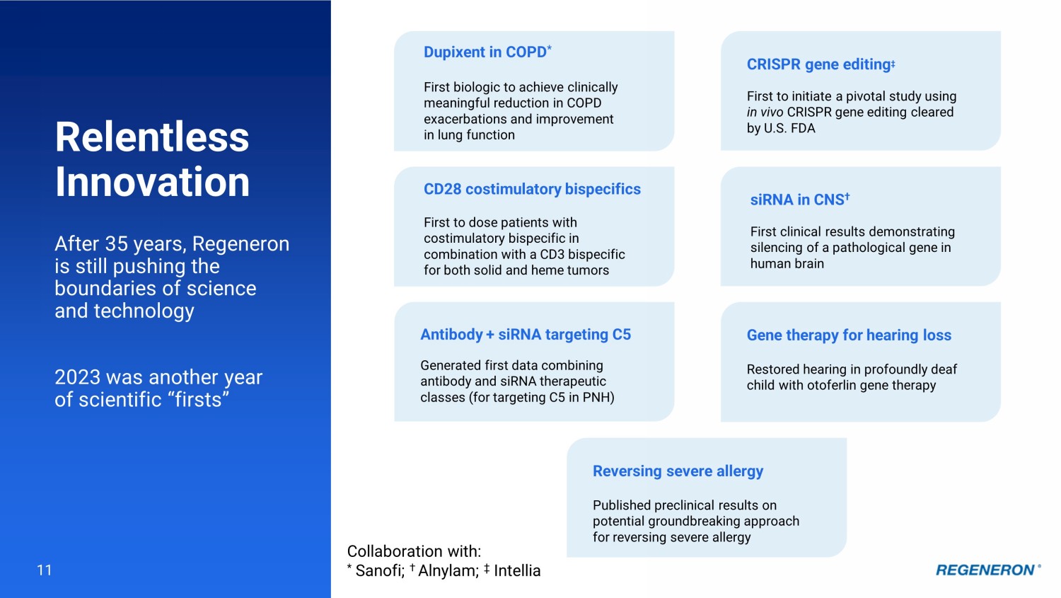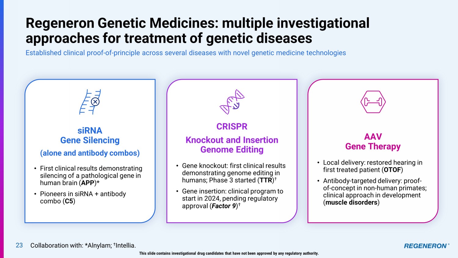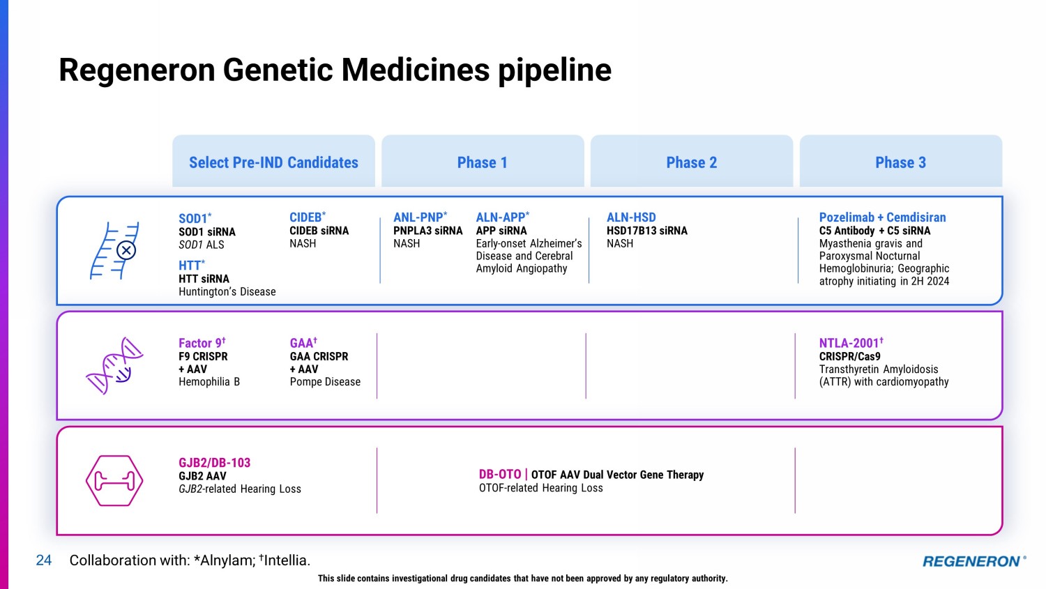 23 Regeneron Genetic Medicines: multiple investigational approaches for treatment of genetic diseases Established clinical proof - of - principle across several diseases with novel genetic medicine technologies siRNA Gene Silencing (alone and antibody combos) • First clinical results demonstrating silencing of a pathological gene in human brain ( APP )* • Pioneers in siRNA + antibody combo ( C5 ) AAV Gene Therapy • Local delivery: restored hearing in first treated patient ( OTOF ) • Antibody - targeted delivery: proof - of - concept in non - human primates; clinical approach in development ( muscle disorders ) CRISPR Knockout and Insertion Genome Editing • Gene knockout: first clinical results demonstrating genome editing in humans; Phase 3 started ( TTR ) † • Gene insertion: clinical program to start in 2024, pending regulatory approval ( Factor 9 ) † This slide contains investigational drug candidates that have not been approved by any regulatory authority. Collaboration with: *Alnylam; † Intellia.