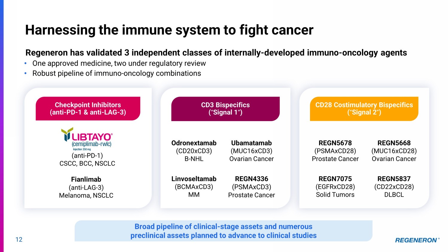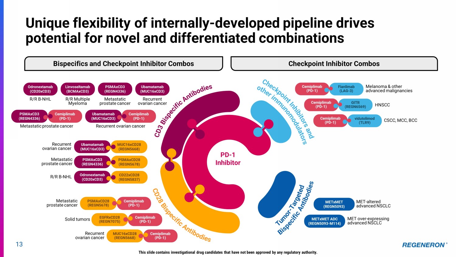 12 Harnessing the immune system to fight cancer Regeneron has validated 3 independent classes of internally - developed immuno - oncology agents • One approved medicine, two under regulatory review • Robust pipeline of immuno - oncology combinations CD28 Costimulatory Bispecifics ( “ Signal 2 ” ) Odronextamab (CD20xCD3) B - NHL Linvoseltamab (BCMAxCD3) MM REGN5678 (PSMAxCD28) Prostate Cancer REGN5668 (MUC16xCD28) Ovarian Cancer Ubamatamab (MUC16xCD3) Ovarian Cancer REGN7075 (EGFRxCD28) Solid Tumors Fianlimab (anti - LAG - 3) Melanoma, NSCLC (anti - PD - 1) CSCC, BCC, NSCLC REGN5837 (CD22xCD28) DLBCL REGN4336 (PSMAxCD3) Prostate Cancer CD3 Bispecifics ( “ Signal 1 ” ) Checkpoint Inhibitors (anti - PD - 1 & anti - LAG - 3) Broad pipeline of clinical - stage assets and numerous preclinical assets planned to advance to clinical studies