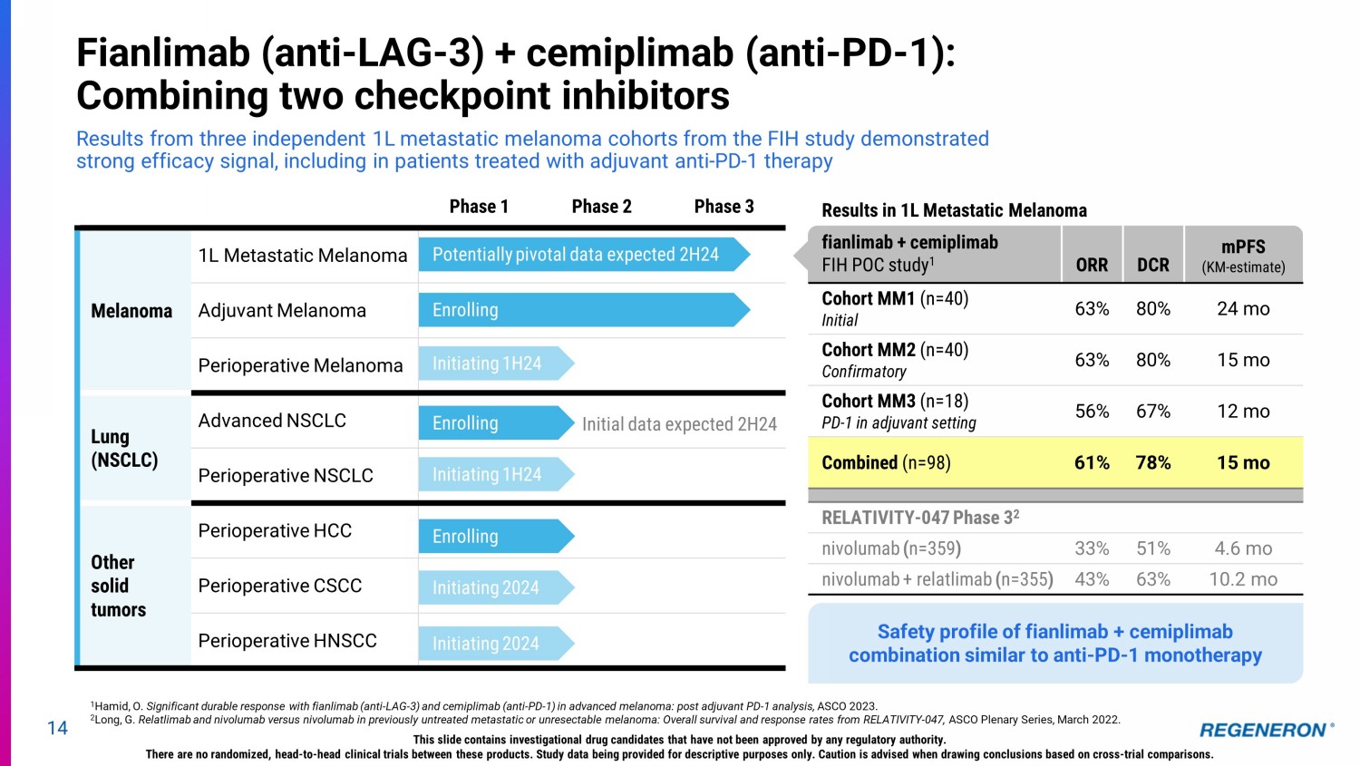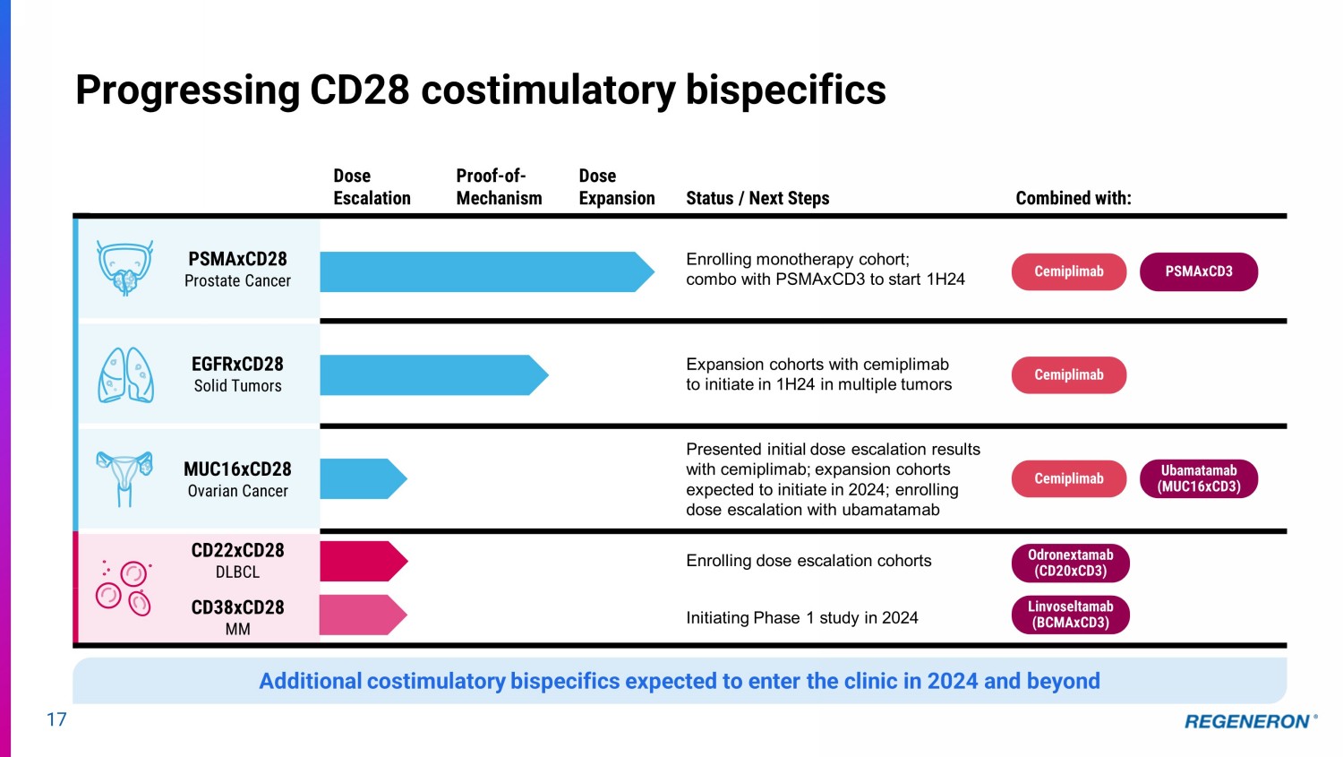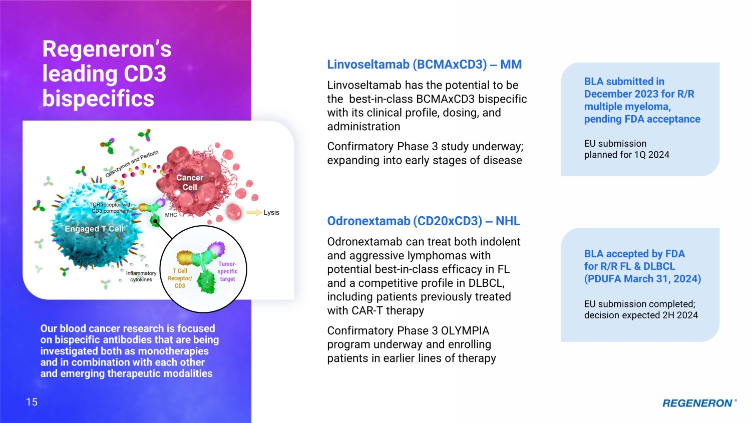 13 Unique flexibility of internally - developed pipeline drives potential for novel and differentiated combinations Odronextamab (CD20xCD3) Linvoseltamab (BCMAxCD3) Ubamatamab (MUC16xCD3) PSMAxCD3 (REGN4336) R/R B - NHL R/R Multiple Myeloma Metastatic prostate cancer Recurrent ovarian cancer Cemiplimab (PD - 1) PSMAxCD3 (REGN4336) Metastatic prostate cancer Cemiplimab (PD - 1) Ubamatamab (MUC16xCD3) Recurrent ovarian cancer Cemiplimab (PD - 1) EGFRxCD28 (REGN7075) Cemiplimab (PD - 1) MUC16xCD28 (REGN5668) Cemiplimab (PD - 1) PSMAxCD28 (REGN5678) Solid tumors Recurrent ovarian cancer Metastatic prostate cancer Fianlimab (LAG - 3) Cemiplimab (PD - 1) Melanoma & other advanced malignancies HNSCC GITR (REGN6569) Cemiplimab (PD - 1) CSCC, MCC, BCC vidutolimod (TLR9) Cemiplimab (PD - 1) METxMET (REGN5093) METxMET ADC (REGN5093 - M114) MET - altered advanced NSCLC MET over - expressing advanced NSCLC Ubamatamab (MUC16xCD3) MUC16xCD28 (REGN5668) Recurrent ovarian cancer PSMAxCD3 (REGN4336) PSMAxCD28 (REGN5678) Metastatic prostate cancer Odronextamab (CD20xCD3) CD22xCD28 (REGN5837) R/R B - NHL PD - 1 Inhibitor This slide contains investigational drug candidates that have not been approved by any regulatory authority. Bispecifics and Checkpoint Inhibitor Combos Checkpoint Inhibitor Combos