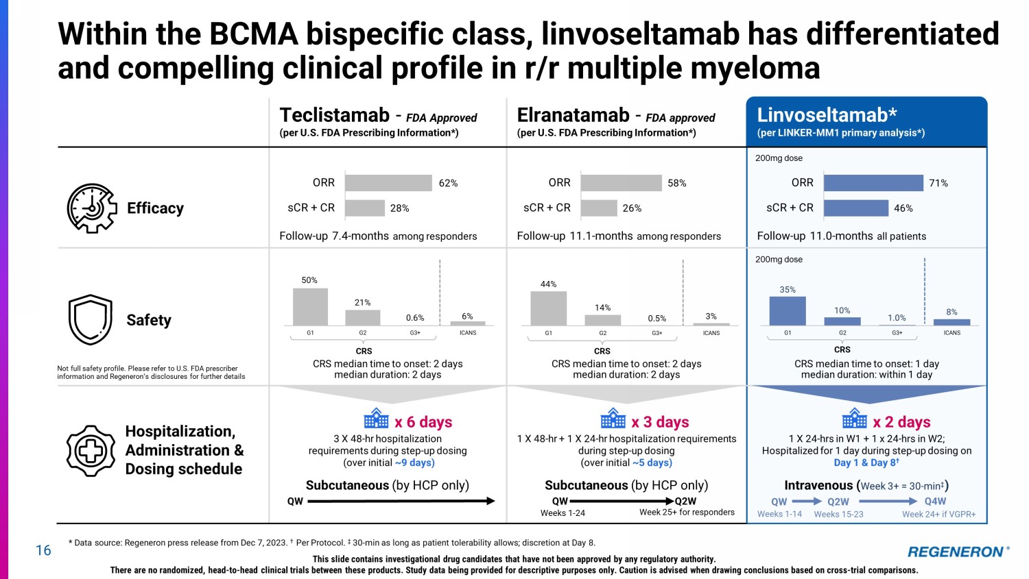 * Data source: Regeneron press release from Dec 7, 2023. † Per Protocol. ‡ 30 - min as long as patient tolerability allows; discretion at Day 8. Teclistamab - FDA Approved (per U.S. FDA Prescribing Information*) Elranatamab - FDA approved (per U.S. FDA Prescribing Information*) Linvoseltamab* (per LINKER - MM1 primary analysis*) Follow - up 7.4 - months among responders Follow - up 11.1 - months among responders Follow - up 11.0 - months all patients CRS median time to onset: 2 days median duration: 2 days CRS median time to onset: 2 days median duration: 2 days CRS median time to onset: 1 day median duration: within 1 day 3 X 48 - hr hospitalization requirements during step - up dosing (over initial ~9 days) Subcutaneous (by HCP only) 1 X 48 - hr + 1 X 24 - hr hospitalization requirements during step - up dosing (over initial ~5 days) Subcutaneous (by HCP only) 1 X 24 - hrs in W1 + 1 x 24 - hrs in W2; Hospitalized for 1 day during step - up dosing on Day 1 & Day 8 † Intravenous ( Week 3+ = 30 - min ‡ ) 44% 14% 0.5% 3% G1 G2 G3+ ICANS 50% 21% 0.6% 6% G1 G2 G3+ ICANS 16 Within the BCMA bispecific class, linvoseltamab has differentiated and compelling clinical profile in r/r multiple myeloma CRS Safety Hospitalization, Administration & Dosing schedule Efficacy Week 25+ for responders Weeks 1 - 24 Q2W QW Q4W Week 24+ if VGPR+ Weeks 1 - 14 Weeks 15 - 23 QW Q2W QW CRS 62% 28% ORR sCR + CR 200mg dose 35% 10% 1.0% 8% G1 G2 G3+ ICANS CRS 200mg dose 58% 26% ORR sCR + CR 71% 46% ORR sCR + CR x 6 days x 3 days x 2 days Not full safety profile. Please refer to U.S. FDA prescriber information and Regeneron’s disclosures for further details This slide contains investigational drug candidates that have not been approved by any regulatory authority. There are no randomized, head - to - head clinical trials between these products. Study data being provided for descriptive purposes only. Caution is advised when drawing conclusions based on cross - trial comparisons.