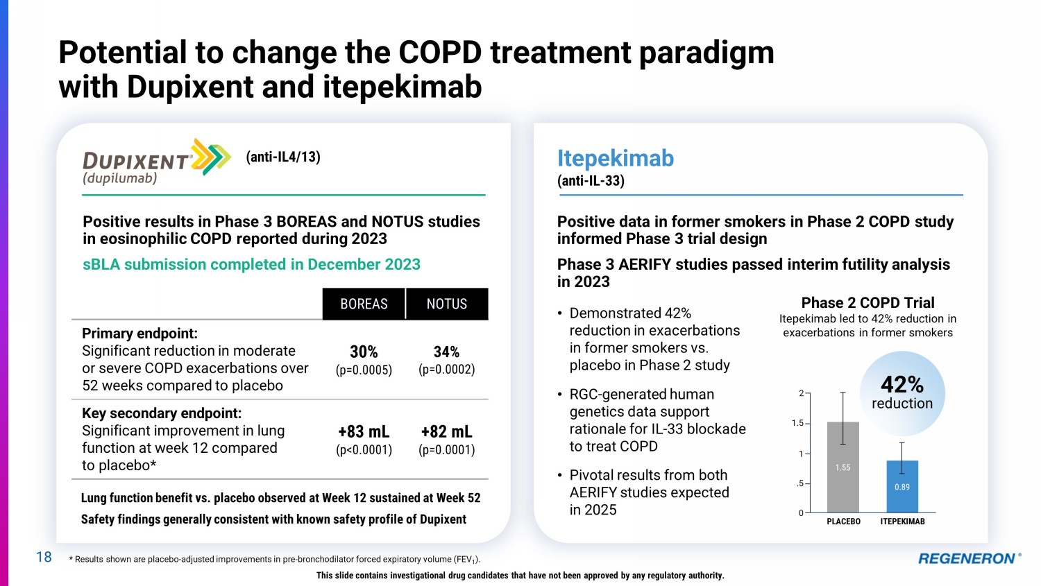 18 Potential to change the COPD treatment paradigm with Dupixent and itepekimab (anti - IL4/13) • Demonstrated 42% reduction in exacerbations in former smokers vs. placebo in Phase 2 study • RGC - generated human genetics data support rationale for IL - 33 blockade to treat COPD • Pivotal results from both AERIFY studies expected in 2025 Positive results in Phase 3 BOREAS and NOTUS studies in eosinophilic COPD reported during 2023 sBLA submission completed in December 2023 Lung function benefit vs. placebo observed at Week 12 sustained at Week 52 Safety findings generally consistent with known safety profile of Dupixent This slide contains investigational drug candidates that have not been approved by any regulatory authority. BOREAS NOTUS Primary endpoint: Significant reduction in moderate or severe COPD exacerbations over 52 weeks compared to placebo 30% (p=0.0005) 34% (p=0.0002) Key secondary endpoint: Significant improvement in lung function at week 12 compared to placebo* +83 mL (p<0.0001) +82 mL (p=0.0001) * Results shown are placebo - adjusted improvements in pre - bronchodilator forced expiratory volume (FEV 1 ). Positive data in former smokers in Phase 2 COPD study informed Phase 3 trial design Phase 3 AERIFY studies passed interim futility analysis in 2023 Itepekimab (anti - IL - 33) Phase 2 COPD Trial Itepekimab led to 42% reduction in exacerbations in former smokers 42% reduction 1.55 0.89 ITEPEKIMAB PLACEBO 2 1.5 1 .5 0